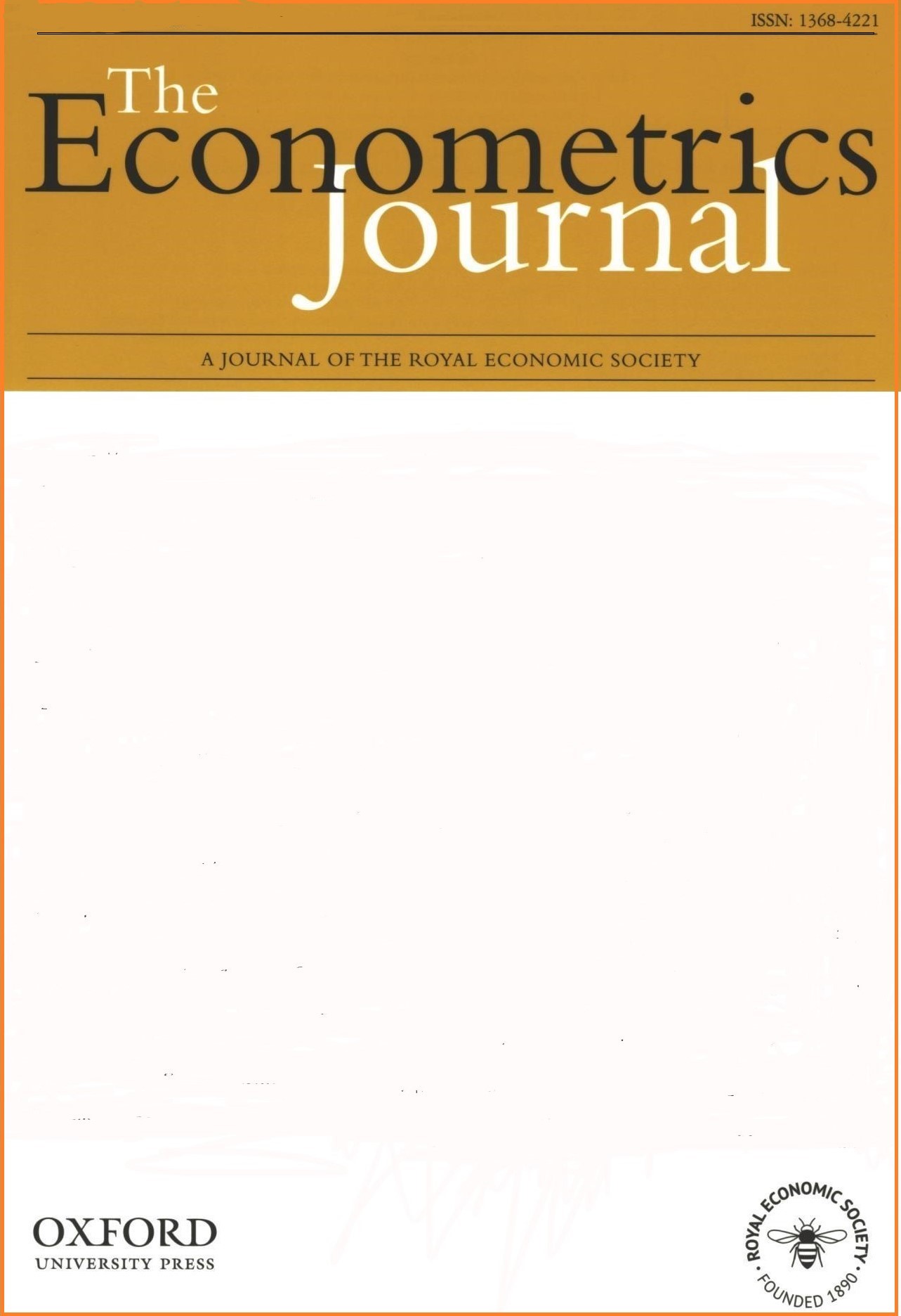 Title The Econometrics Journal : A Journal of the Royal Economic Society Issue data Oxford : Oxford University Press ISSN 1368-4221 (print) 1368-423X (online) Note [Do r. 2020 vydavateľ Blackwell Publishing]. - Registrovaný: Current Contents Connect. - Registrovaný: Web of Science. - Registrovaný: Scopus Numbering [Vol. 1, no. 1 (1998)]-2024 Periodicity 3x ročne Years of Consumption 2004-2024 Years of Storage uchovávame trvale vo fonde SEK Document kind časopisy Language English Country of Edition Great Britain systematics 330.43 - Ekonometria Keywords ekonometria * modely ekonometrické * metódy ekonometrické URL https://academic.oup.com/ectj Database PERIODIKÁ - Súborný záznam periodika References Súborný záznam: použite odkaz na záznam čísla alebo zväzku Numbers 2024: 1, 3 2023: 1, 2, 3 2022: 1, 2 Bunches 2021: 1-3 2020: 1-3 2019: 1-3 2018: 1-3 2017: 1-3 2016: 1-3 2015: 1-3 2014: 1-3 2013: 1-3 2012: 1-3 2011: 1-3 2010: 1-3 2009: 1-3 + príl. 2008: 1-3 2007: 1-3 2006: 1-3 2005: 1-3 2004: 1-2