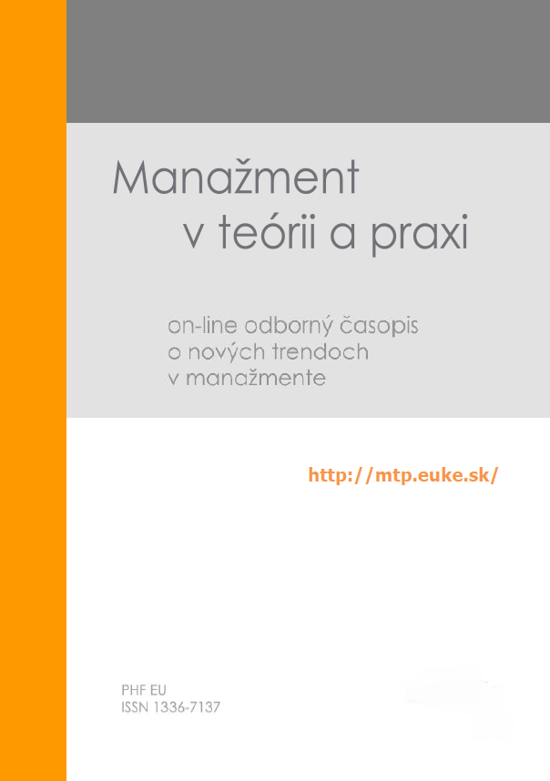 Title Manažment v teórii a praxi [elektronický zdroj] : online odborný časopis o nových trendoch v manažmente Corporation Podnikovohospodárska fakulta EU so sídlom v Košiciach . Katedra ekonómie a manažmentu Issue data Košice : Katedra ekonómie a manažmentu PHF EU ISSN 1336-7137 (online) Note Do r. 2021 vychádzal 4x ročne. - Do č. 1/2022 vydávala Katedra manažmentu PHF EU. - Spracovaný v EKO-INDEX 2005- Periodicity 2x ročne Document kind electronic magazines Language Slovak, Czech, English Country of Edition Slovak Republic systematics 65.012.4 - Technika a metódy riadenia. Riadenie. Vedenie. Autorita Keywords manažment * podnik * stratégia podniková * zdroje ľudské * riadenie znalostí * procesy podnikové * kultúra podniková * systémy informačné Annotation Odborné príspevky, analýzy, výskumy, komentáre a diskusie z oblasti podnikového manažmentu, organizácie verejnej správy, riadenia podniku, manažmentu ľudských zdrojov, technológie riadenia a podobne. URL http://mtp.euke.sk/ Database PERIODIKÁ - Súborný záznam periodika References (299) - PUBLIKAČNÁ ČINNOSŤ (159) - ARTICLES References Súborný záznam: použite odkaz na záznam čísla alebo zväzku Numbers 2025: 1, 2 2024: 1, 2 2023: 1, 2 2022: 1, 2 2021: 1, 2, 3, 4 2020: 1, 2, 3, 4 2019: 1, 2, 3, 4 2018: 1, 2, 3, 4 2017: 1, 2, 3, 4 2016: 1, 2, 3, 4 2015: 1-2, 3, 4 2014: 1-2, 3-4 2013: 1-2, 3, 4 2012: 1-2, 3, 4 2011: 1, 2, 3 2010: 1, 2-3, 4 2009: 1-2, 3-4 2008: 1-2, 3-4 2007: 1-2, 3, 4 2006: 1, 2, Špeciálne vydanie, 3-4 2005: 1, 2, 3