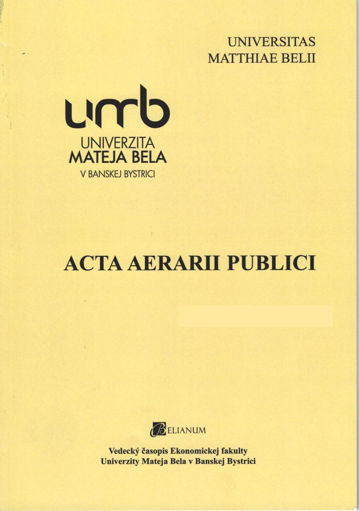 Názov Acta aerarii publici : vedecký časopis Ekonomickej fakulty Univerzity Mateja Bela v Banskej Bystrici Súbežný názov Acta aerarii publici: Scientific Journals published by the Faculty of Economics, Matej Bel University, Banská Bystrica, Slovakia Korporácia Univerzita Mateja Bela v Banskej Bystrici . Ekonomická fakulta Vydavateľské údaje Banská Bystrica : Belianum ISSN 1336-8818 (print) , 2989-3186 (online) DOI https://doi.org/10.24040/aap Poznámky Od roku 2023 vychádza v online verzii. - Spracovaný v EKO-INDEX 2006- Periodicita 2x ročne Roky odberu 2006-2022 Doba uchovávania uchovávame trvale vo fonde SEK Druh dokumentu časopisy Jazyk dokumentu slovenčina Krajina vydania Slovenská republika Systematika 65.012.4 - Technika a metódy riadenia. Riadenie. Vedenie. Autorita Heslá teória finančná * financie verejné * bankovníctvo * účtovníctvo * manažment finančný Anotácia Publikovanie pôvodných vedeckých prác, referátov a recenzií týkajúcich sa finančnej teórie a praxe. Prioritne je orientovaný na oblasti verejných aj podnikových financií, finančného manažmentu, teórie financií, centrálneho a komerčného bankovníctva, poisťovníctva, účtovníctva, informačných technológií, aplikácie matematiky a informatiky vo finančníctve. URL https://aap.umb.sk/?page_id=1981 Báza dát PERIODIKÁ - Súborný záznam periodika Odkazy (21) - PUBLIKAČNÁ ČINNOSŤ (210) - ČLÁNKY Odkazy Súborný záznam: použite odkaz na záznam čísla alebo zväzku Čísla 2026: 1 2025: 2, 1, Special Issue 2024: 1, 2 2023: 1, 2 2022: 1, 2 Zväzky 2021: 1-2 2020: 1-2 2019: 1-2 2018: 1-2 2017: 1-2 2016: 1-2 2015: 1-2 2014: 1+ špeciálne číslo 2013: 1-2 2012: 1-2 2011: 1-2 2010: 1-2 2009: 1-2 2008: 1-2 2007: 1-2 2006: 2