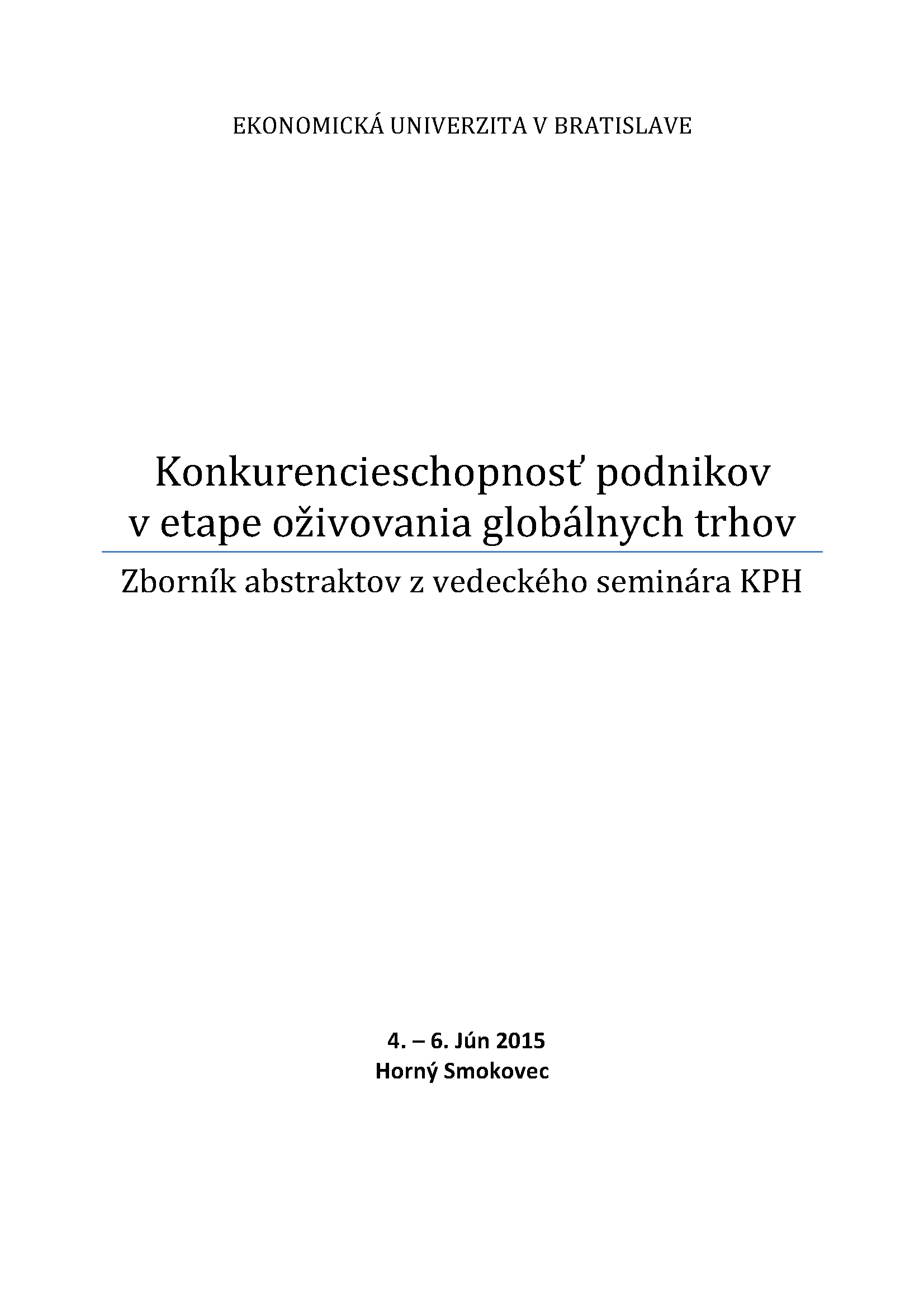 Title Konkurencieschopnosť podnikov v etape oživovania globálnych trhov [elektronický zdroj] : zborník abstraktov z vedeckého seminára KPH : 4.-6. jún 2015 Horný Smokovec Author info redakčné a zostavovateľské práce: Nora Grisáková, Jakub Kintler, Iveta Kufelová, Peter Štetka, Eleonora Fendeková Another authors Grisáková Nora (Compiler) EUBFPMKPO - Katedra podnikovohospodárska FPM Kintler Jakub (Compiler) EUBFPMKPO - Katedra podnikovohospodárska FPM Kufelová Iveta (Compiler) EUBFPMKPO - Katedra podnikovohospodárska FPM Štetka Peter (Compiler) EUBFPMKPO - Katedra podnikovohospodárska FPM Fendeková Eleonora (Compiler) EUBFPMKPO - Katedra podnikovohospodárska FPM Event/Corporation Konkurencieschopnosť podnikov v etape oživovania globálnych trhov . Vedecký seminár , Horný Smokovec, Slovensko , 4.-6.6.2015 Fakulta podnikového manažmentu EU . Katedra podnikovohospodárska Issue data Bratislava : Vydavateľstvo EKONÓM , 2015. - CD-ROM [56 s., 3,34 AH] Issue 1. vyd. ISBN 978-80-225-4115-2 Note VEGA 1/0697/15 Document kind miscellanea Language Slovak Country of Edition Slovak Republic systematics 339.137 - Konkurencia Keywords konkurencieschopnosť * podnik * trh * globalizácia hospodárstva Public work category Editorial and reported works (bibliographies, magazines, encyclopedies, catalogs, dictionaries, year-books...) Database PUBLIKAČNÁ ČINNOSŤ Copy count 3, currently available 2, at library only 1 References (17) - PUBLIKAČNÁ ČINNOSŤ Call number 885926, 885927, 887835 No. of Archival Copy E15 00798-001, originál dokumentu