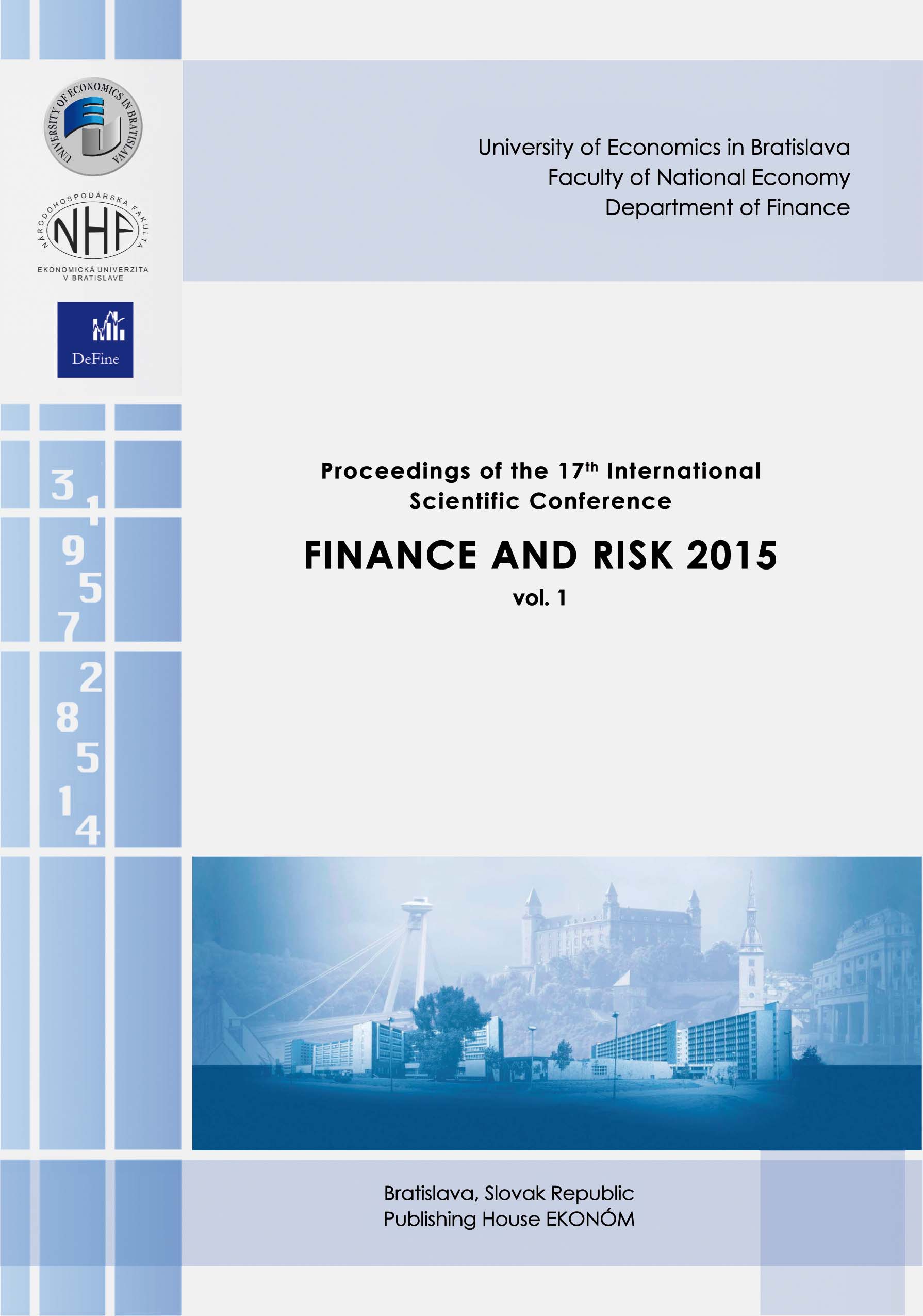 Title Finance and risk 2015 : proceedings of the 17th international scientific conference : 23. - 24. november 2015, Bratislava, Slovak Republic. Vol. 1 Author info editors: Kristína Hudoková, Jana Kočkovičová, Marek Niňaj, reviewers: Martin Alexy ... [et al.] Another authors Hudoková Kristína (Editor) EUBFNHKFI - Katedra financií FNH Kočkovičová Jana (Editor) EUBFNHKFI - Katedra financií FNH Niňaj Marek (Editor) EUBFNHKFI - Katedra financií FNH Alexy Martin (Recenzent) EUBFNHKFI - Katedra financií FNH Bartalosová Erika (Recenzent) EUBUEM - Ústav ekonómie a manažmentu EU - zrušené Event/Corporation Finance and risk 2015 . International scientific conference , 17. , Bratislava, Slovensko , 23.-24.11.2015 Národohospodárska fakulta EU . Katedra financií Issue data Bratislava : Publishing house EKONÓM , 2015. - 294 s. Issue 1st ed. ISBN 978-80-225-4218-0 Other Interrelated Works Finance and risk 2015 : proceedings of the 17th international scientific conference : 23. - 24. november 2015, Bratislava, Slovak Republic / Bratislava : Publishing house EKONÓM, 2015 ; Hudoková Kristína ; Kočkovičová Jana ; Niňaj Marek ; Alexy Martin ; Bartalosová Erika ; Finance and risk 2015 International scientific conference ; Národohospodárska fakulta EU Katedra financií Document kind miscellanea Language English Country of Edition Slovak Republic systematics 336 - Financie. Verejné financie. Colníctvo. Bankovníctvo. Peňažníctvo Keywords financie * riziko finančné * trh finančný * zdaňovanie * bankovníctvo * riadenie rizík * kríza finančná * stabilita finančná Database BOOKS Copy count 2, currently available 1, at library only 1 References (18) - PUBLIKAČNÁ ČINNOSŤ (1) - BOOKS Call number 890664, 890665 No. of Archival Copy E16 00259-001, kópia titul. strany