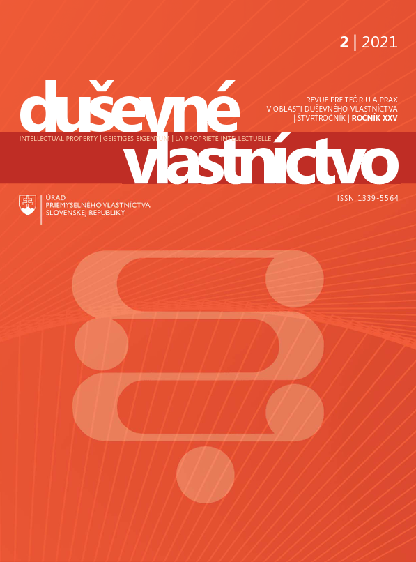 Title Duševné vlastníctvo [elektronický zdroj] : revue pre teóriu a prax v oblasti duševného vlastníctva Parallel title Intellectual property : revue for theory and practice in the field of intellectual property Geistiges Eigentum La Propriété intellectuelle Issue data Banská Bystrica : Úrad priemyselného vlastníctva SR ISSN 1339-5564 Year, No. Roč. 25, č. 2 (2021) Periodicals status Accepted (17.08.2021) Document kind electronic magazines Language Slovak Country of Edition Slovak Republic Database PERIODIKÁ - Prijaté čísla References - PERIODIKÁ - Súborný záznam periodika (1) - PUBLIKAČNÁ ČINNOSŤ (2) - ARTICLES