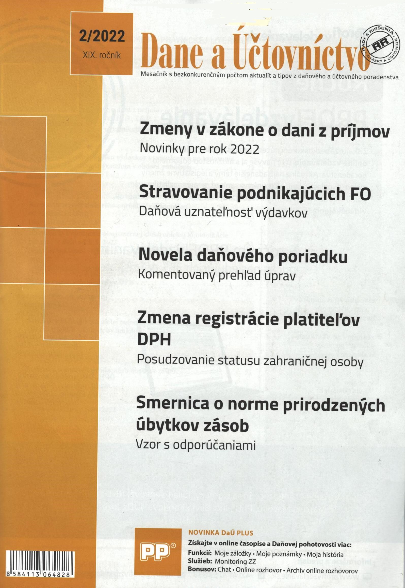 Title Dane a účtovníctvo : rady a riešenia : mesačník s bezkonkurenčným počtom aktualít a tipov z daňového a účtovného poradenstva Issue data Žilina : Poradca podnikateľa ISSN 1336-426X Year, No. Roč.19, č. 2 (2022) Periodicals status Accepted (27.01.2022) Document kind časopisy Language Slovak Country of Edition Slovak Republic Database PERIODIKÁ - Prijaté čísla Copy count 2, currently available 0, at library only 2 References - PERIODIKÁ - Súborný záznam periodika (9) - ARTICLES