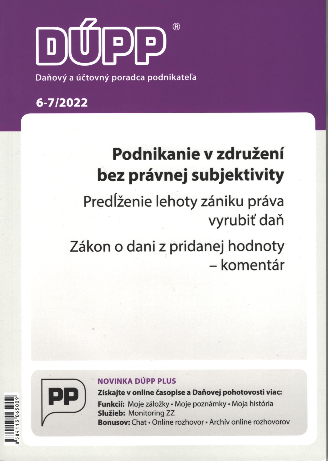 Title Daňový a účtovný poradca podnikateľa Issue data Žilina : Poradca podnikateľa ISSN 1335-0897 Year, No. Roč. 27, č. 6-7 (2022) Periodicals status Accepted (05.04.2022) Document kind časopisy Language Slovak Country of Edition Slovak Republic Database PERIODIKÁ - Prijaté čísla Copy count 3, currently available 0, at library only 3 References - PERIODIKÁ - Súborný záznam periodika (3) - ARTICLES