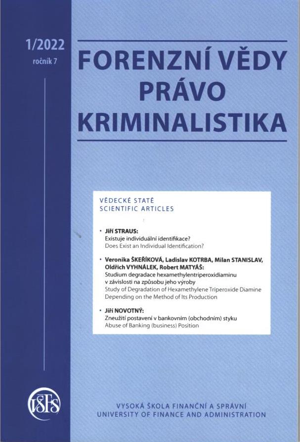 Title Forenzní vědy, právo, kriminalistika : Vědecké studie a analýzy: vědecký časopis : Scientific Studies and Analyses: Scientific Journal Issue data Praha : Vysoká škola finanční a správní ISSN 2533-4387 Year, No. Roč. 7, č. 1 (2022) Periodicals status Accepted (22.08.2022) Document kind časopisy Language Czech Country of Edition Czech Republic Database PERIODIKÁ - Prijaté čísla Copy count 1, currently available 0, at library only 1 References - PERIODIKÁ - Súborný záznam periodika (3) - ARTICLES