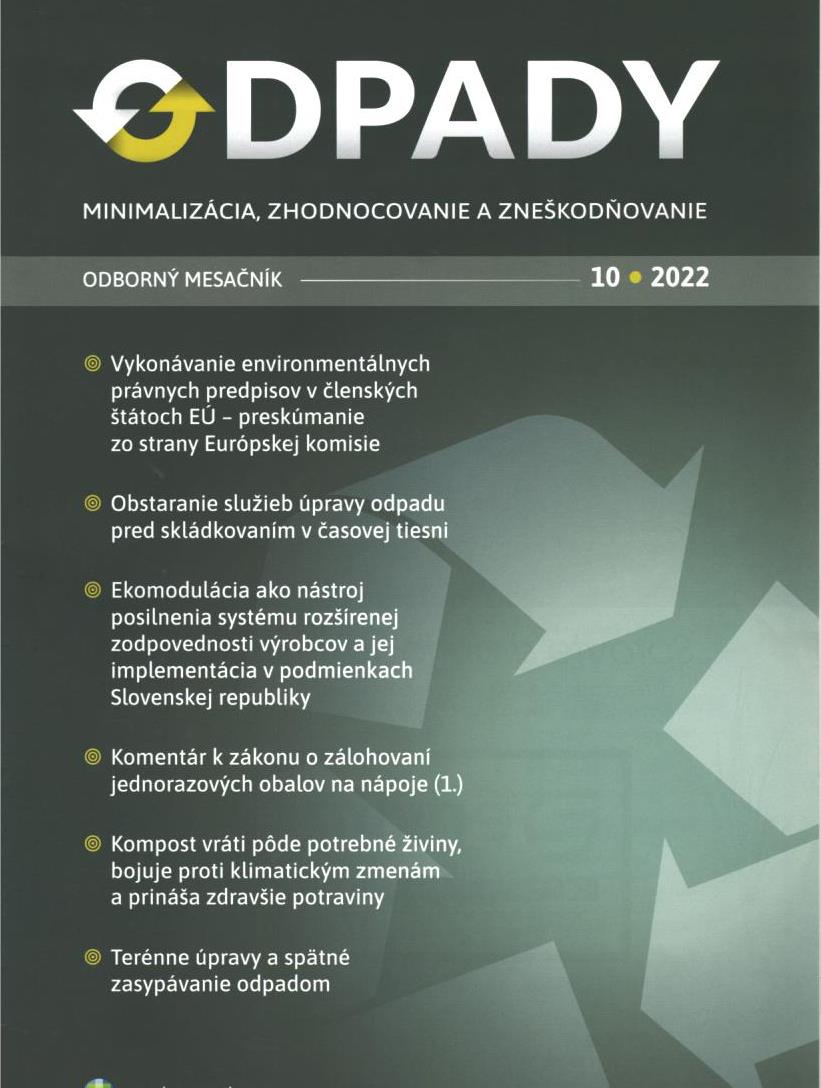 Title Odpady : minimalizácia, zhodnocovanie, a zneškodňovanie Issue data Bratislava : Wolters Kluwer SR ISSN 1335-7808 Year, No. Roč. 22, č. 10 (2022) Periodicals status Accepted (27.10.2022) Document kind časopisy Language Slovak Country of Edition Slovak Republic Database PERIODIKÁ - Prijaté čísla Copy count 1, currently available 0, at library only 1 References - PERIODIKÁ - Súborný záznam periodika (3) - ARTICLES