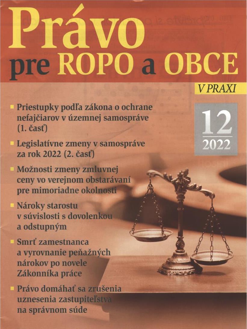 Title Právo pre ROPO a obce v praxi : mesačník plný odborných informácií pre rozpočtové, príspevkové organizácie a obce Issue data Bratislava : Wolters Kluwer ISSN 1337-7523 Year, No. Roč. 15, č. 12 (2022) Periodicals status Accepted (22.12.2022) Document kind časopisy Language Slovak Country of Edition Slovak Republic Database PERIODIKÁ - Prijaté čísla Copy count 1, currently available 0, at library only 1 References - PERIODIKÁ - Súborný záznam periodika (5) - ARTICLES