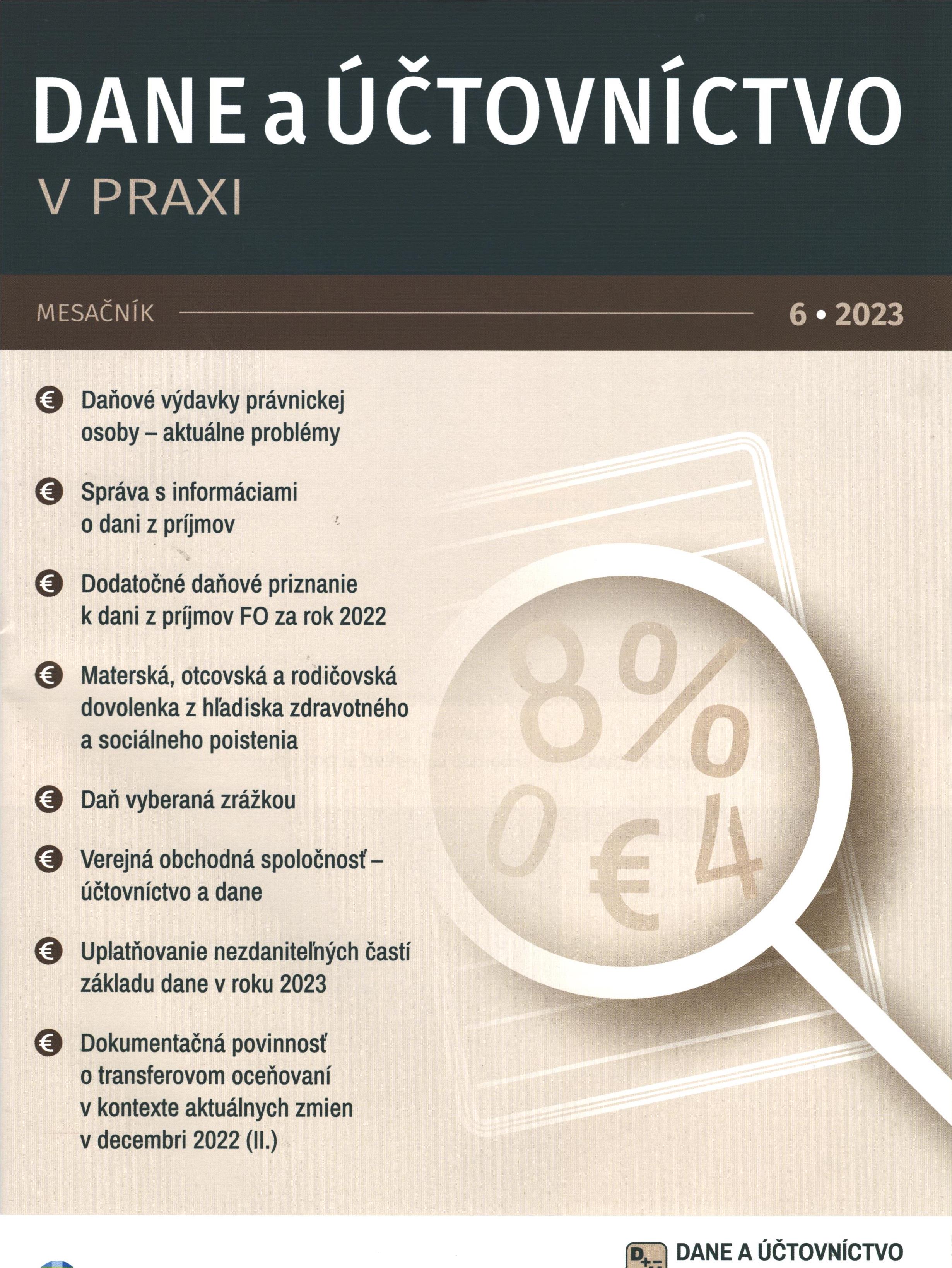 Title Dane a účtovníctvo v praxi : odborný mesačník Issue data Bratislava : Wolters Kluwer ISSN 1335-7034 Year, No. Roč. 28, č. 6 (2023) Periodicals status Accepted (13.06.2023) Document kind časopisy Language Slovak Country of Edition Slovak Republic Database PERIODIKÁ - Prijaté čísla Copy count 2, currently available 0, at library only 2 References - PERIODIKÁ - Súborný záznam periodika (1) - PUBLIKAČNÁ ČINNOSŤ (6) - ARTICLES
