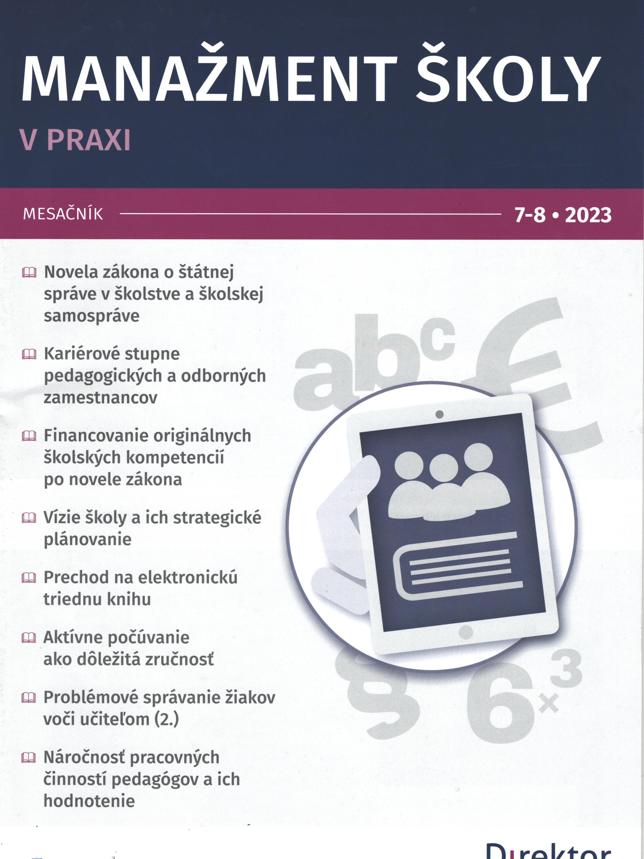 Title Manažment školy v praxi : [odborný mesačník] Issue data Bratislava : Wolters Kluwer ISSN 1336-9849 Year, No. Roč. 18, č. 7-8 (2023) Periodicals status Accepted (17.08.2023) Document kind časopisy Language Slovak Country of Edition Slovak Republic Database PERIODIKÁ - Prijaté čísla Copy count 2, currently available 0, at library only 2 References - PERIODIKÁ - Súborný záznam periodika (5) - ARTICLES