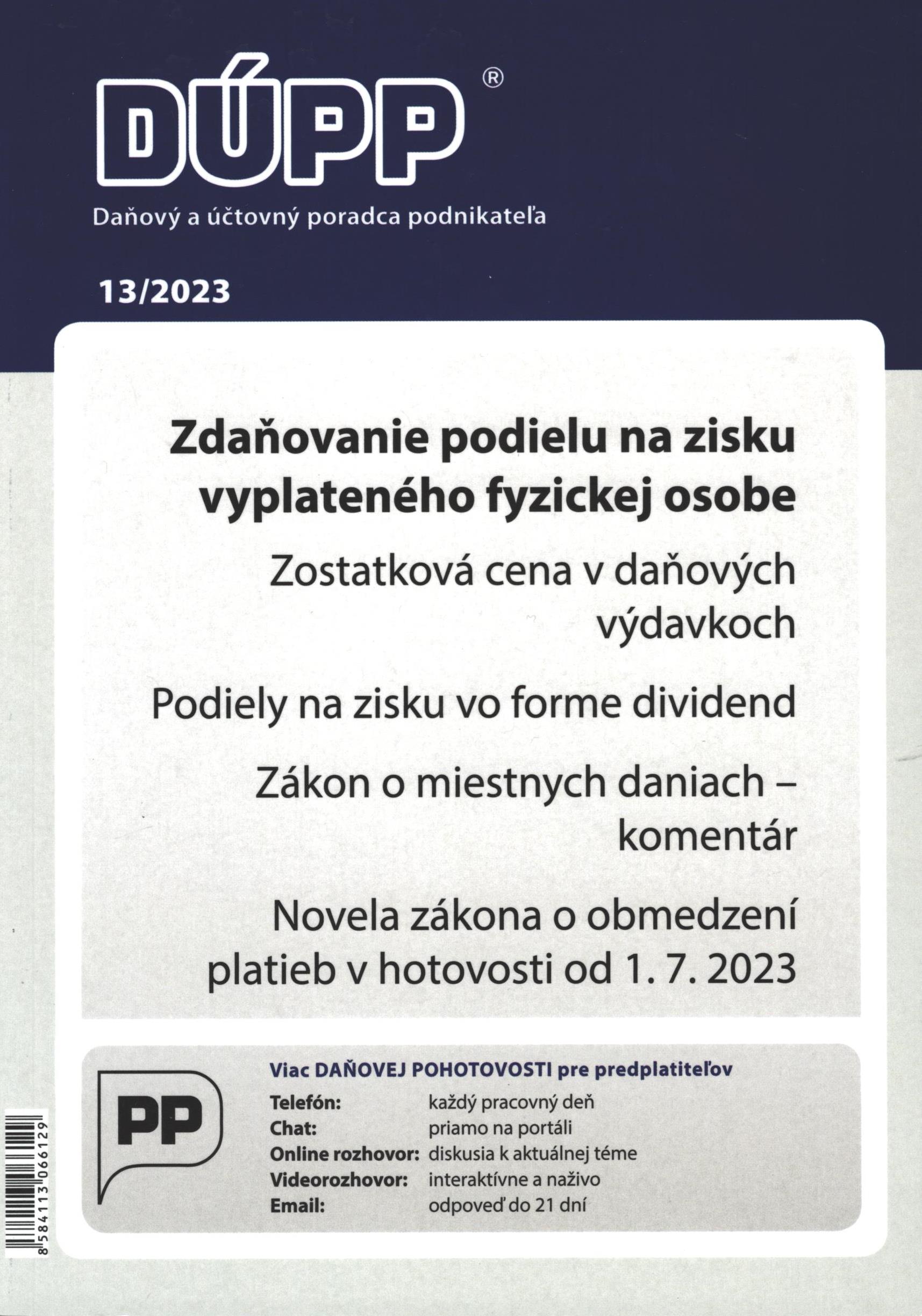 Title Daňový a účtovný poradca podnikateľa Issue data Žilina : Poradca podnikateľa ISSN 1335-0897 Year, No. Roč. 28, č. 13 (2023) Periodicals status Accepted (13.09.2023) Document kind časopisy Language Slovak Country of Edition Slovak Republic Database PERIODIKÁ - Prijaté čísla Copy count 2, currently available 0, at library only 2 References - PERIODIKÁ - Súborný záznam periodika (2) - ARTICLES