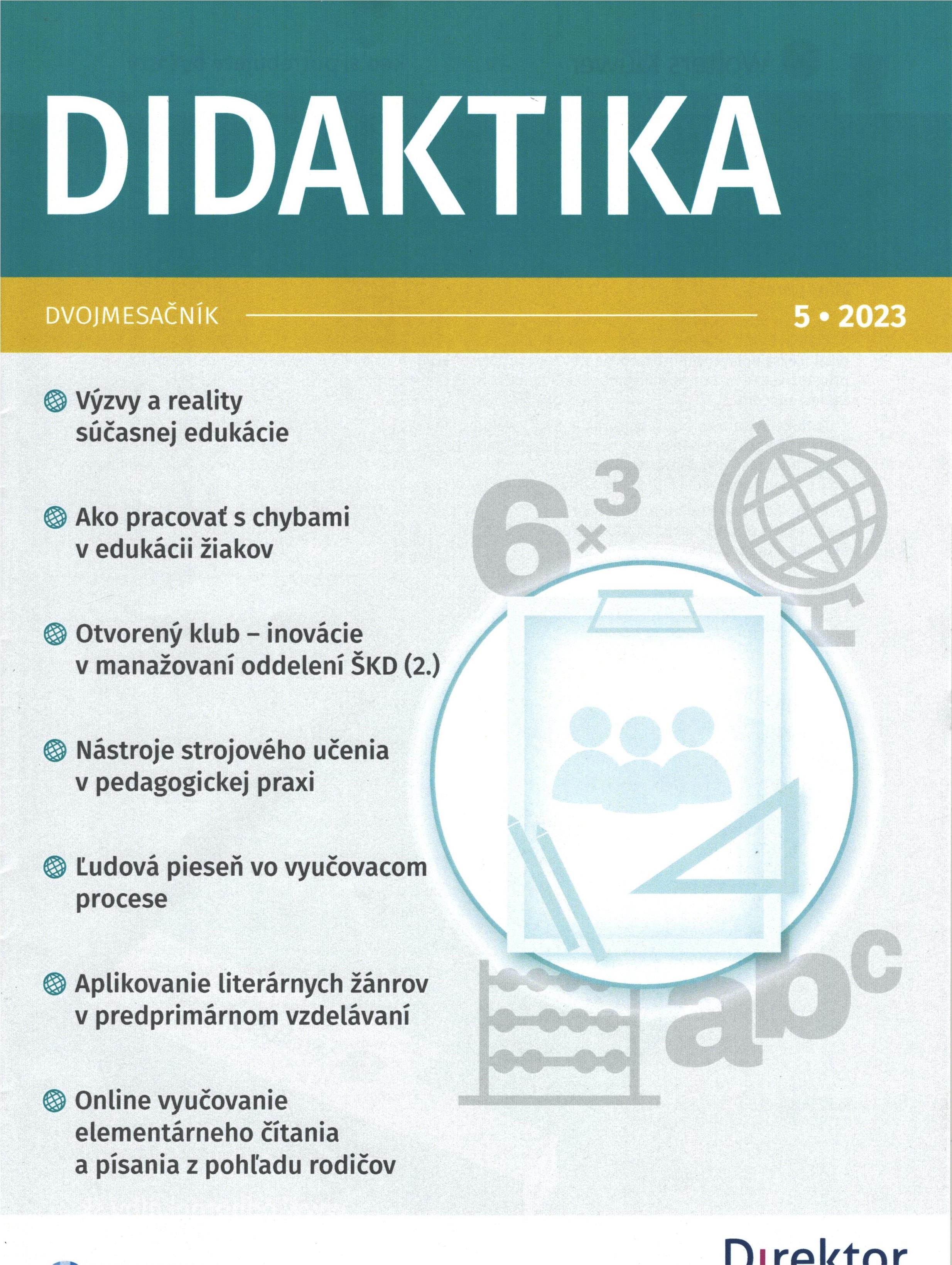 Title Didaktika : [odborný dvojmesačník] Issue data Bratislava : Wolters Kluwer SR ISSN 1338-2845 Year, No. Roč. 4, č. 5 (2023) Periodicals status Accepted (04.10.2023) Document kind časopisy Language Slovak Country of Edition Slovak Republic Database PERIODIKÁ - Prijaté čísla Copy count 1, currently available 0, at library only 1 References - PERIODIKÁ - Súborný záznam periodika (5) - ARTICLES