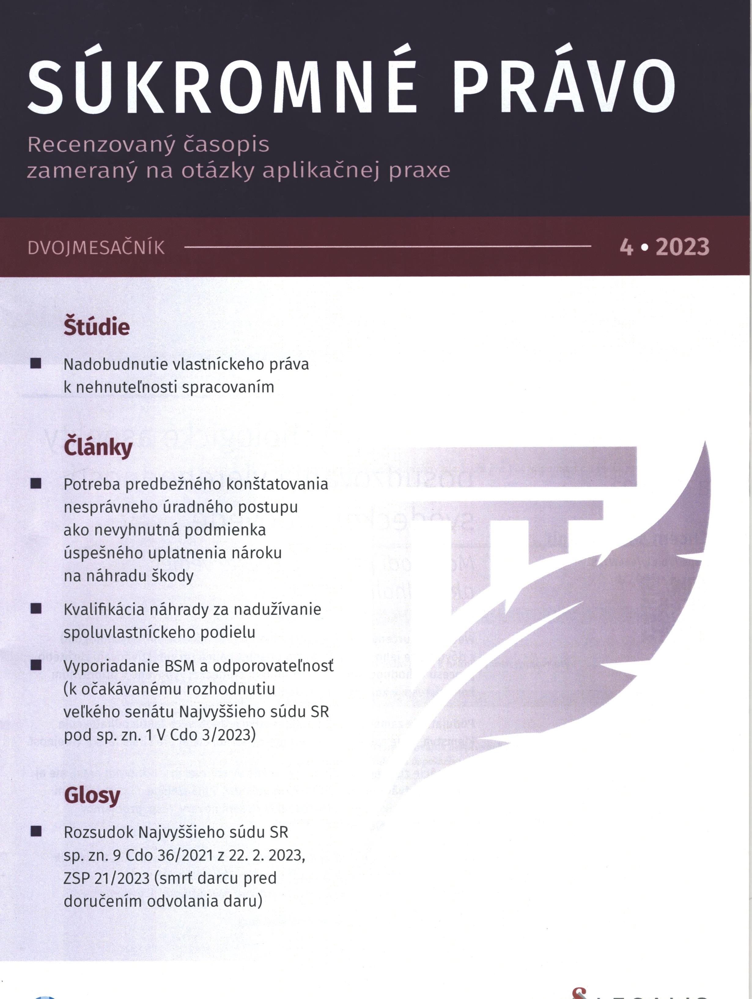 Title Súkromné právo : recenzovaný časopis zameraný na otázky aplikačnej praxe Issue data Bratislava : Wolters Kluwer SR ISSN 1339-8652 Year, No. Roč. 9, č. 4 (2023) Periodicals status Accepted (09.10.2023) Document kind časopisy Language Slovak Country of Edition Slovak Republic Database PERIODIKÁ - Prijaté čísla Copy count 1, currently available 0, at library only 1 References - PERIODIKÁ - Súborný záznam periodika (2) - ARTICLES