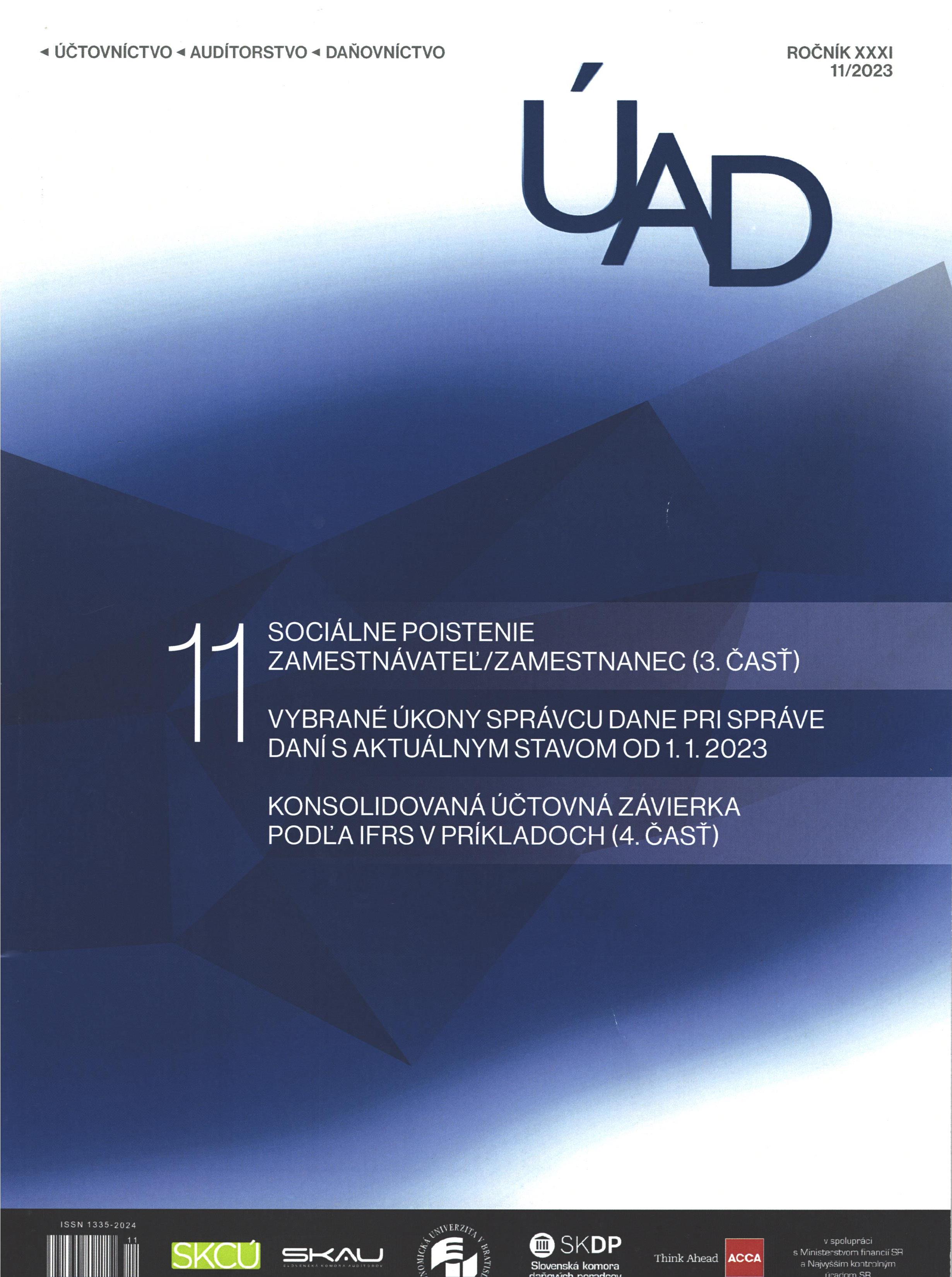 Title Účtovníctvo - audítorstvo - daňovníctvo : v teórii a praxi Parallel title Accounting. Audit. Taxation: in theory and praxis Issue data Bratislava : Slovenská komora certifikovaných účtovníkov ISSN 1335-2024 Year, No. Roč. 31, č. 11 (2023) Periodicals status Accepted (29.11.2023) Document kind časopisy Language Slovak Country of Edition Slovak Republic Database PERIODIKÁ - Prijaté čísla Copy count 2, currently available 0, at library only 2 References - PERIODIKÁ - Súborný záznam periodika (1) - PUBLIKAČNÁ ČINNOSŤ (2) - ARTICLES