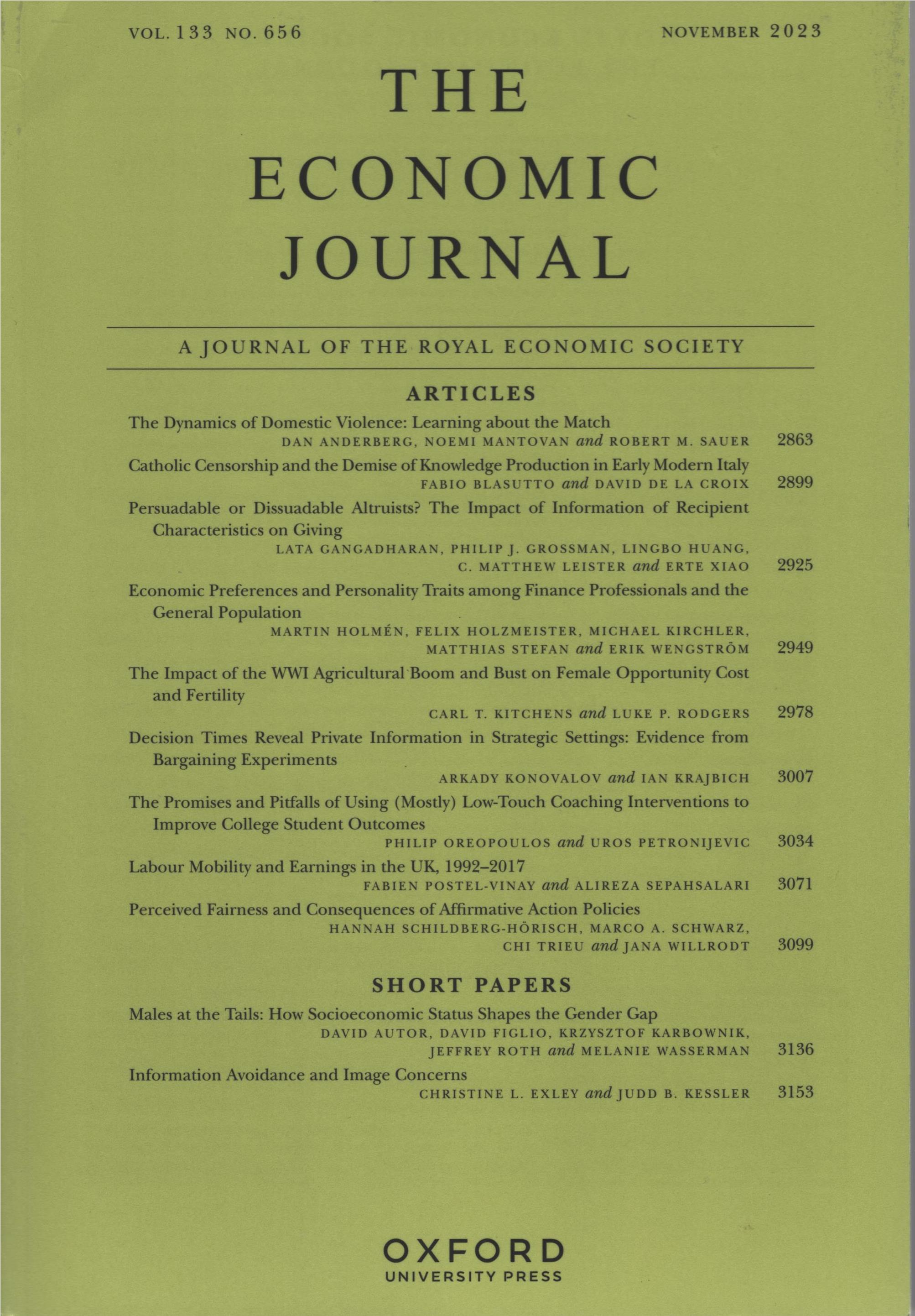 Title The Economic Journal : A Journal of the Royal Economic Society Issue data London : Royal Economic Society ISSN 0013-0133 Year, No. Vol. 133, no. 656 (November) Periodicals status Accepted (05.12.2023) Document kind časopisy Language English Country of Edition Great Britain Database PERIODIKÁ - Prijaté čísla Copy count 1, currently available 0, at library only 1 References - PERIODIKÁ - Súborný záznam periodika
