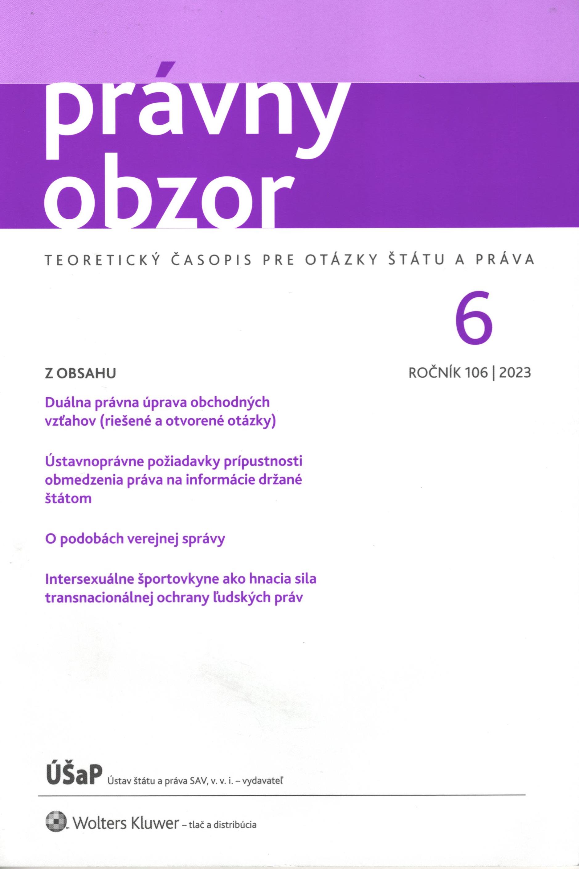 Title Právny obzor : teoretický časopis pre otázky štátu a práva Parallel title Theoretical Review for Issues of State and Law Issue data Bratislava : Ústav štátu a práva SAV ISSN 0032-6984 Year, No. Roč. 106, č. 6 (2023) Periodicals status Accepted (19.12.2023) Document kind časopisy Language Slovak Country of Edition Slovak Republic Database PERIODIKÁ - Prijaté čísla Copy count 1, currently available 0, at library only 1 References - PERIODIKÁ - Súborný záznam periodika (2) - ARTICLES