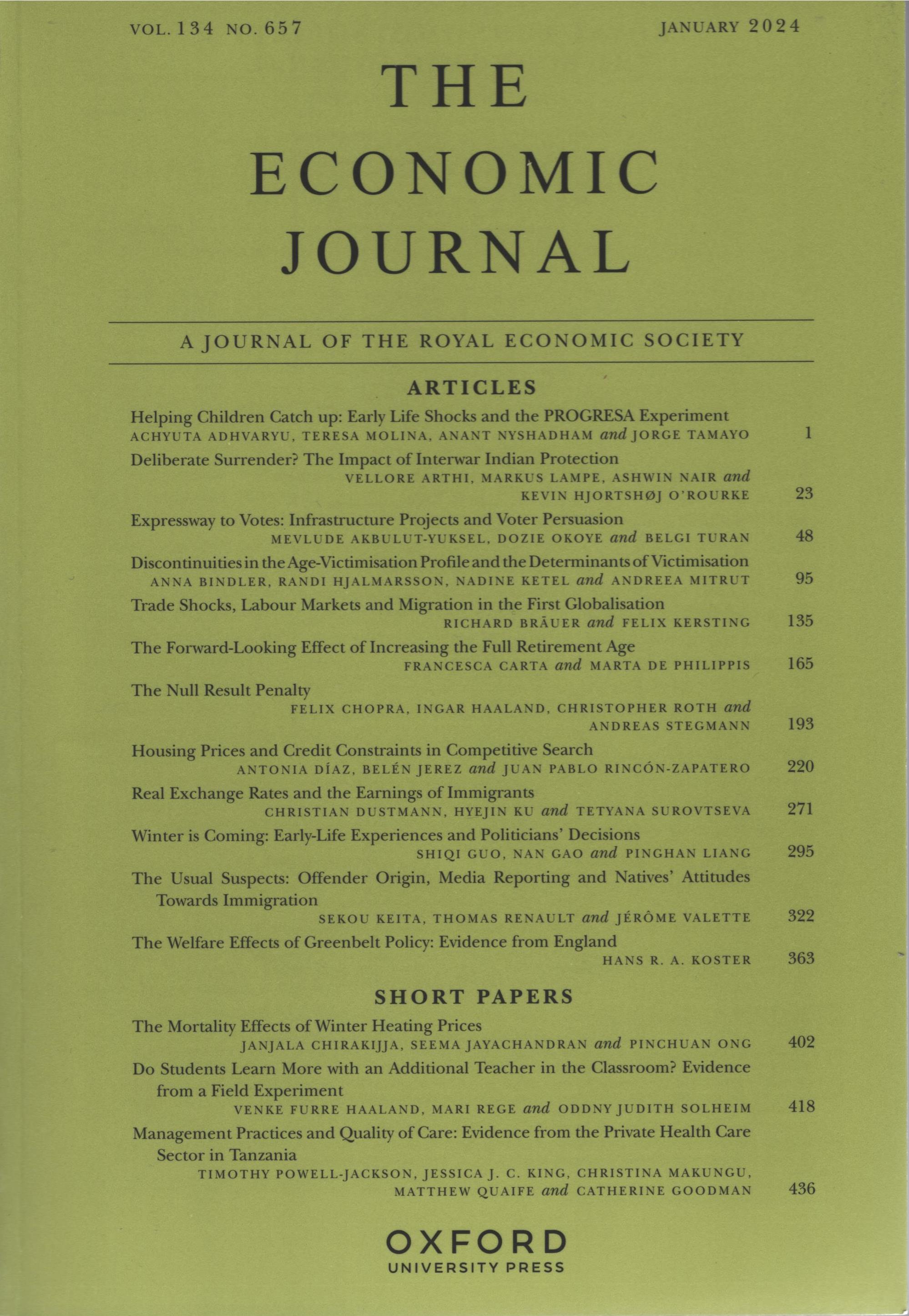 Title The Economic Journal : A Journal of the Royal Economic Society Issue data London : Royal Economic Society ISSN 0013-0133 Year, No. Vol. 134, no. 657 (January) Periodicals status Accepted (06.02.2024) Document kind časopisy Language English Country of Edition Great Britain Database PERIODIKÁ - Prijaté čísla Copy count 1, currently available 0, at library only 1 References - PERIODIKÁ - Súborný záznam periodika