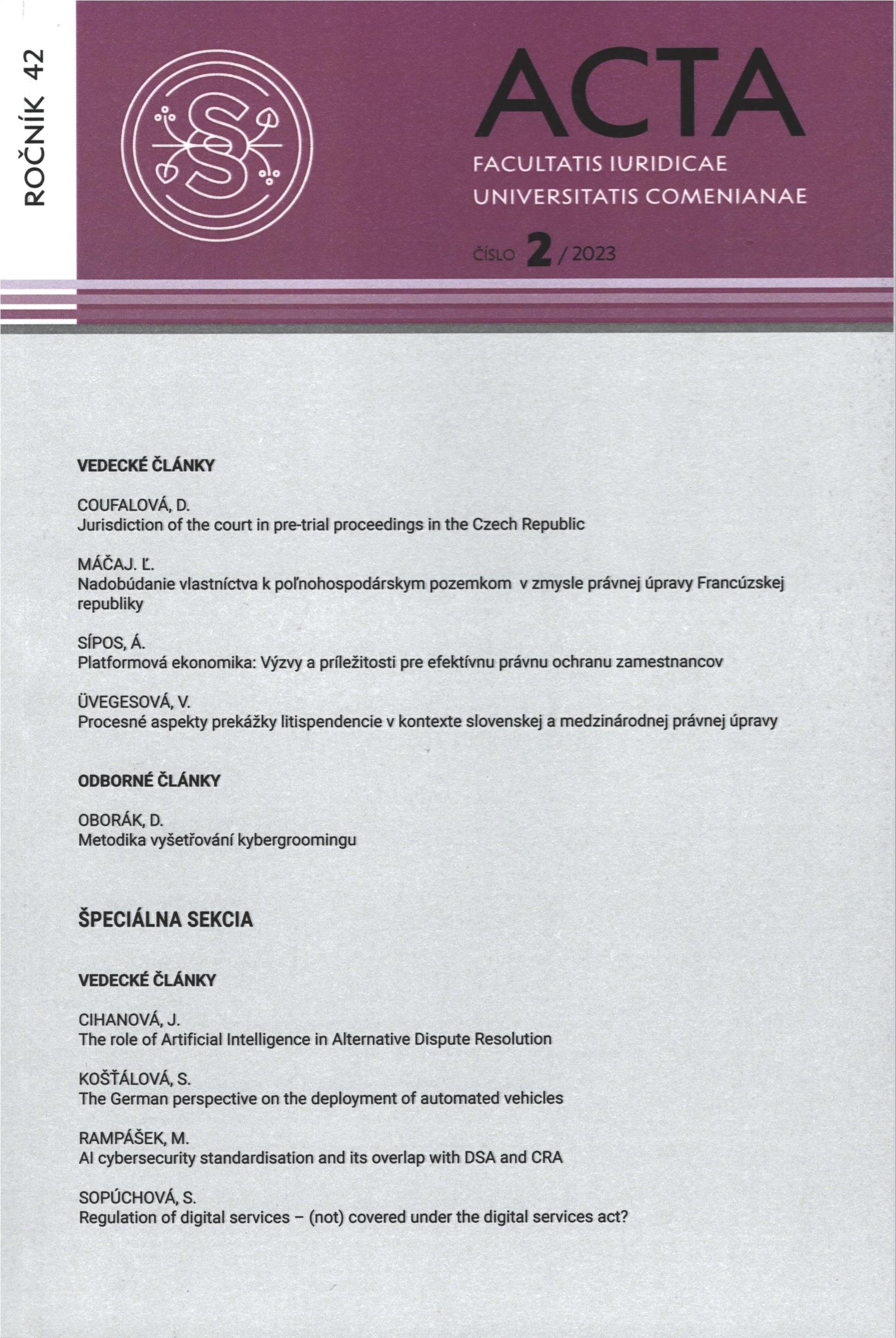 Title Acta Facultatis Iuridicae Universitatis Comenianae : vedecký časopis Právnickej fakulty Issue data Bratislava : Univerzita Komenského v Bratislave ISSN 1336-6912 Year, No. Roč. 42, č. 2 (2023) Periodicals status Accepted (21.02.2024) Document kind časopisy Language Slovak Country of Edition Slovak Republic Database PERIODIKÁ - Prijaté čísla Copy count 1, currently available 0, at library only 1 References - PERIODIKÁ - Súborný záznam periodika (4) - ARTICLES