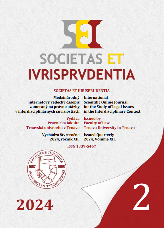 Title Societas et iurisprudentia [elektronický zdroj] : medzinárodný internetový vedecký časopis zameraný na právne otázky v interdisciplinárnych súvislostiach Parallel title Societas et iurisprudentia: International Scientific Online Journal for the Study of Legal Issues in the Inderdisciplinary Context Issue data Trnava : Trnavská univerzita v Trnave ISSN 1339-5467 Year, No. Roč. 12, no. 2 (2024) Periodicals status Accepted (02.10.2024) Document kind electronic magazines Language Multiple languages Country of Edition Slovak Republic Database PERIODIKÁ - Prijaté čísla References - PERIODIKÁ - Súborný záznam periodika (2) - ARTICLES