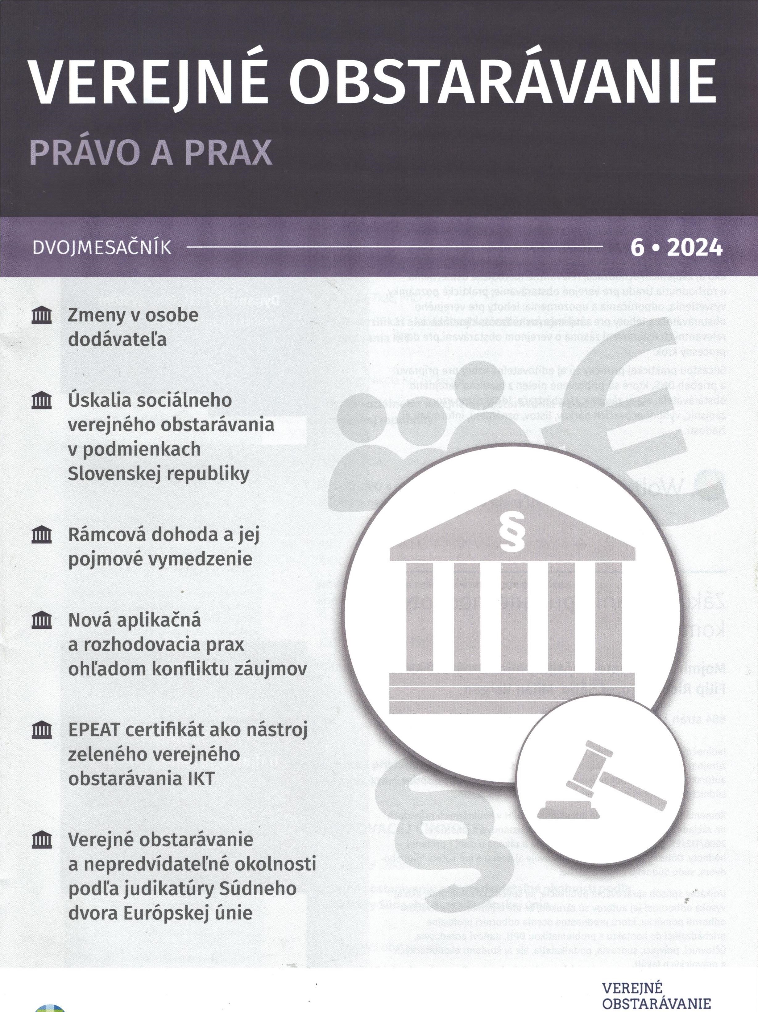 Title Verejné obstarávanie - právo a prax : odborný dvojmesačník Issue data Bratislava : Wolters Kluwer SR ISSN 1339-5963 Year, No. Roč. 11, č. 6 (2024) Periodicals status Accepted (09.12.2024) Document kind časopisy Language Slovak Country of Edition Slovak Republic Database PERIODIKÁ - Prijaté čísla Copy count 1, currently available 0, at library only 1 References - PERIODIKÁ - Súborný záznam periodika (5) - ARTICLES