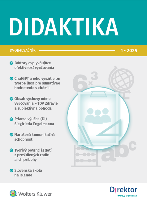 Title Didaktika : [odborný dvojmesačník] Issue data Bratislava : Wolters Kluwer SR ISSN 1338-2845 Year, No. Roč. 6, č. 1 (2025) Periodicals status Accepted (27.01.2025) Document kind časopisy Language Slovak Country of Edition Slovak Republic Database PERIODIKÁ - Prijaté čísla References - PERIODIKÁ - Súborný záznam periodika (3) - ARTICLES