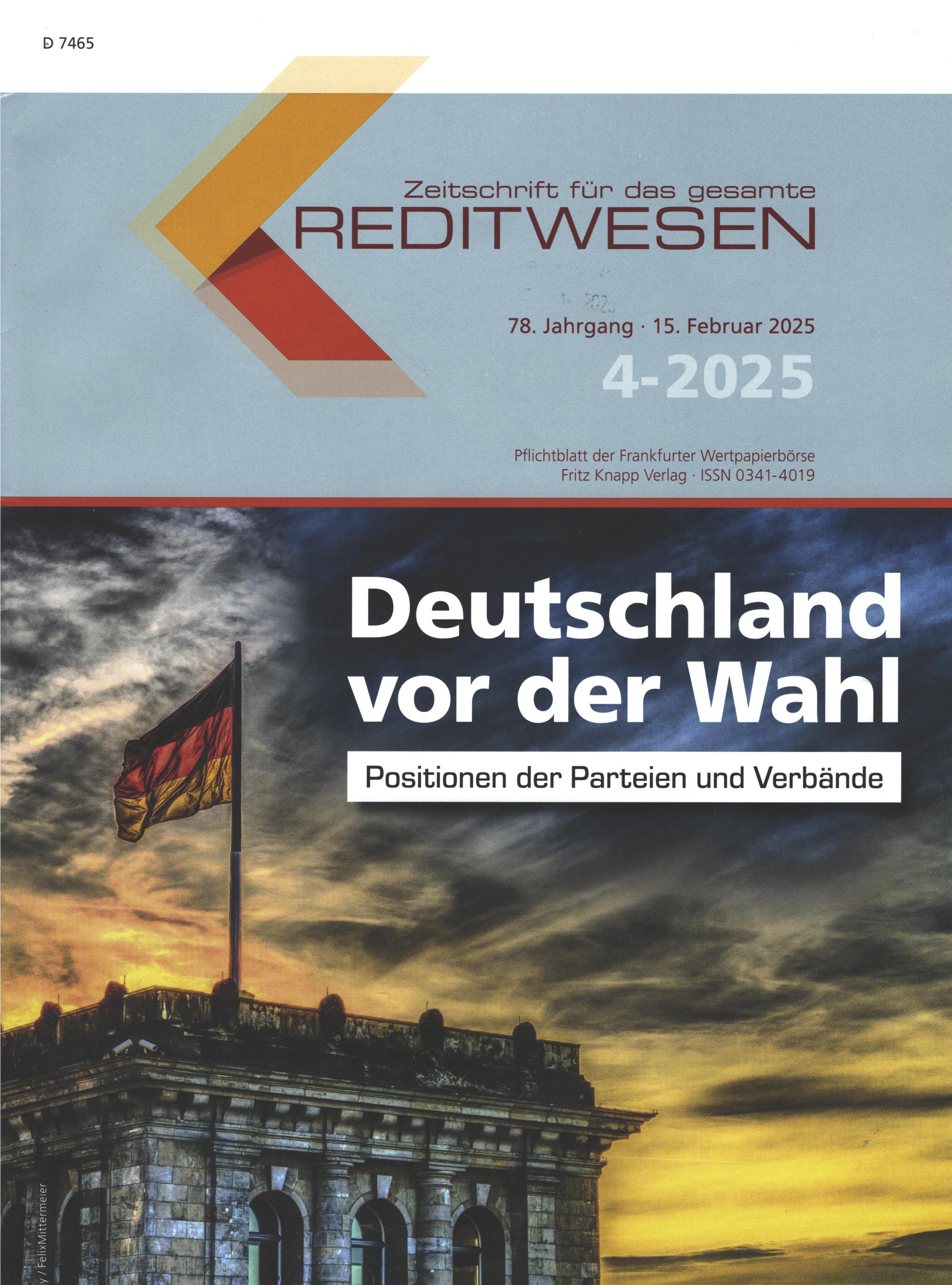 Title Zeitschrift für das gesamte Kreditwesen : Pflichtblatt der Frankfurter Wertpapierbörse Issue data Frankfurt am Main : Fritz Knapp Verlag ISSN 0341-4019 Year, No. Jg. 78, Hf. 4 (2025) Periodicals status Accepted (17.02.2025) Document kind časopisy Language German Country of Edition Germany Database PERIODIKÁ - Prijaté čísla Copy count 1, currently available 0, at library only 1 References - PERIODIKÁ - Súborný záznam periodika