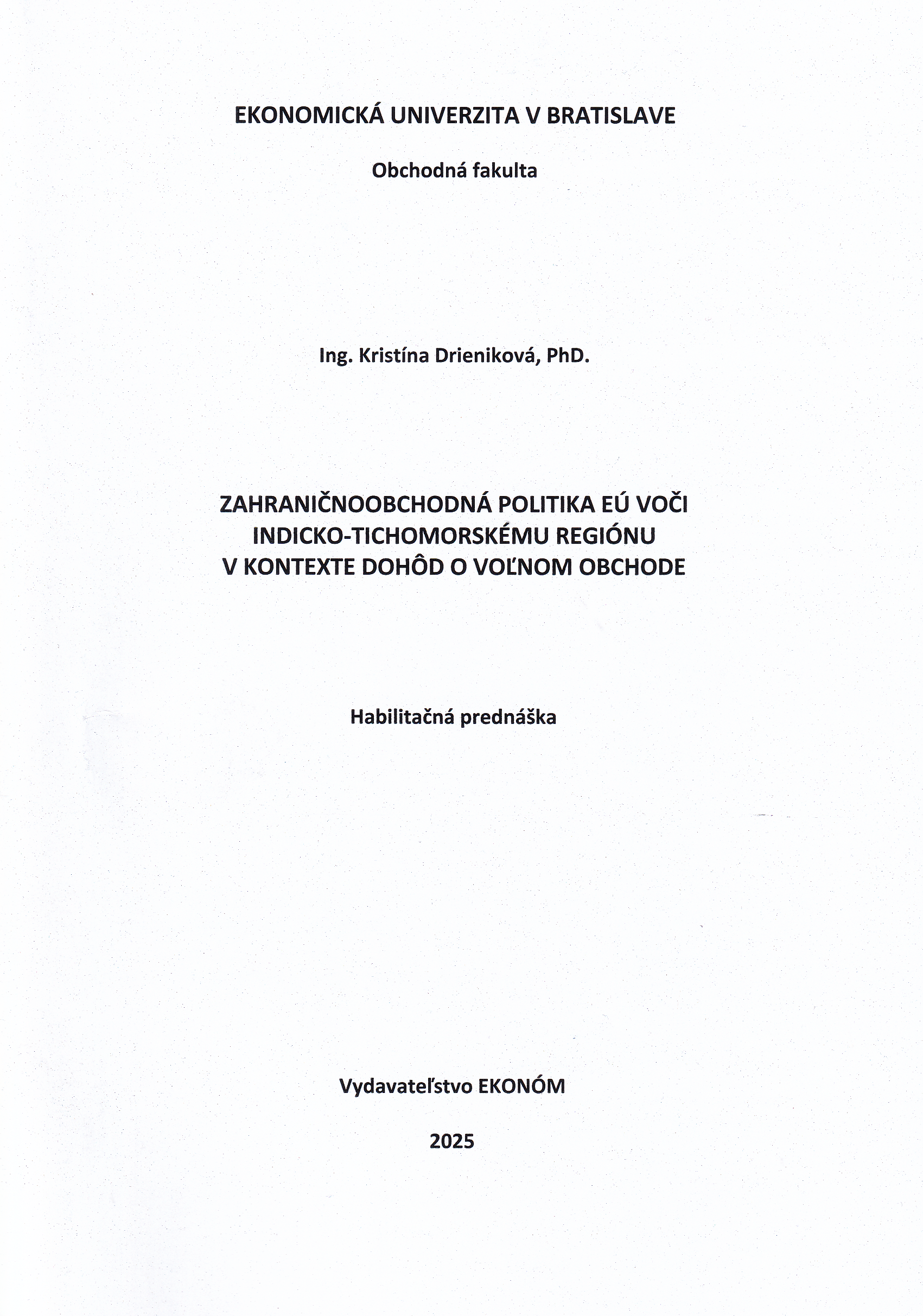 Title Zahraničnoobchodná politika EÚ voči indicko-tichomorskému regiónu v kontexte dohôd o voľnom obchode : habilitačná prednáška : odbor habilitačného konania a inauguračného konania: obchod a marketing v odbore ekonómia a manažment Author info Kristína Drieniková Author Drieniková Kristína EUBOBFKMO - Katedra medzinárodného obchodu OBF Corporation Ekonomická univerzita v Bratislave . Obchodná fakulta Issue data Bratislava : Vydavateľstvo EKONÓM , 2025. - 64 s. Issue 1. vydanie ISBN 978-80-225-5209-7 Document kind prehľady (obzory) Language Slovak Country of Edition Slovak Republic systematics 339.54 - Politika zahraničného obchodu Keywords vzťahy obchodné * politika zahraničnoobchodná * dohody obchodné medzinárodné * obchod voľný * Európska únia * India * Tichomorie Database BOOKS Copy count 2, currently available 0, at library only 2 Call number 930736, 930737
