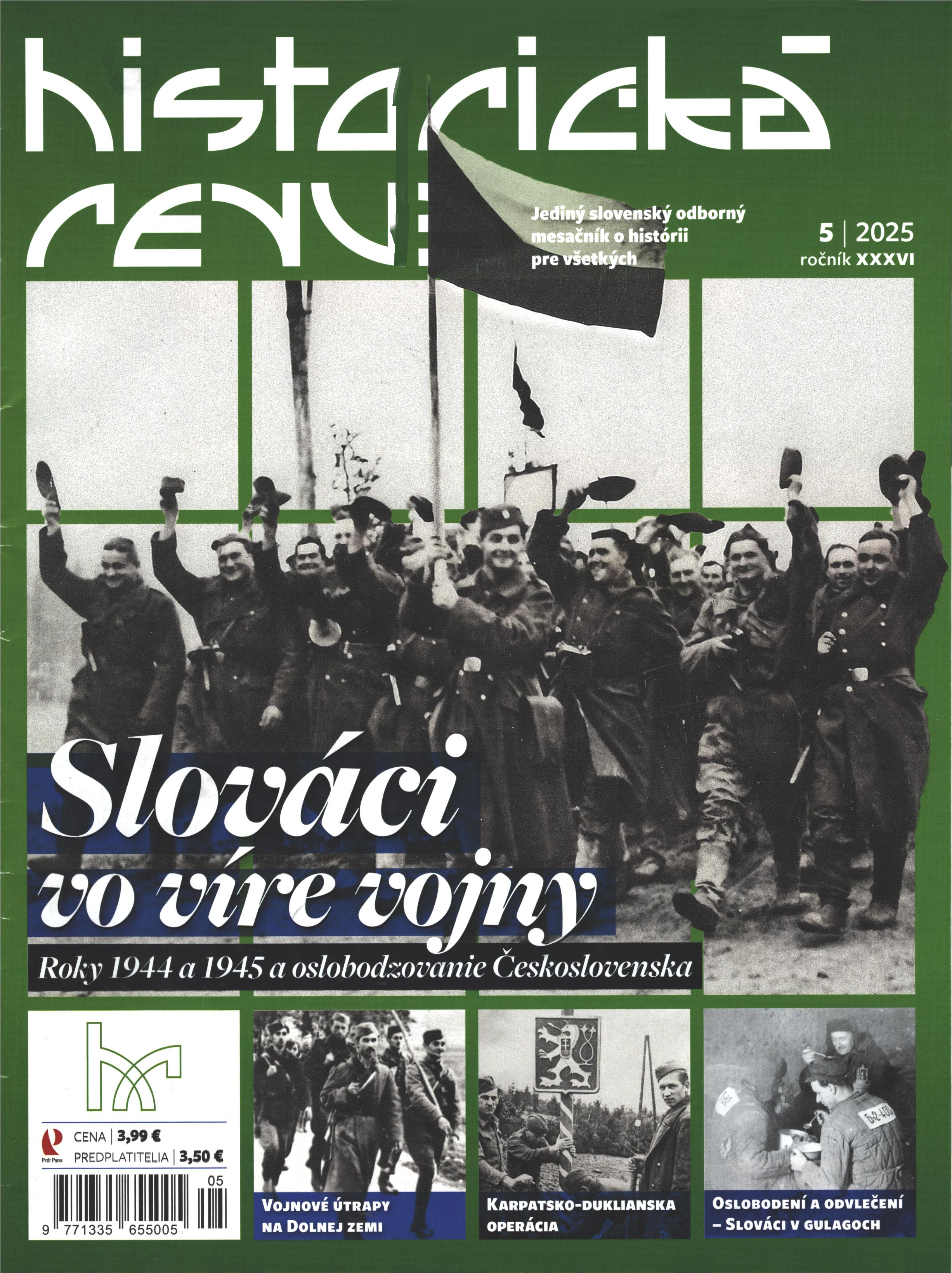 Title Historická revue : jediný slovenský odborný mesačník o histórii pre všetkých Issue data Bratislava : Petit Press ISSN 1335-6550 Year, No. Roč. 36, č. 5 (2025) Periodicals status Accepted (05.05.2025) Document kind časopisy Language Slovak Country of Edition Slovak Republic Database PERIODIKÁ - Prijaté čísla Copy count 2, currently available 0, at library only 2 References - PERIODIKÁ - Súborný záznam periodika