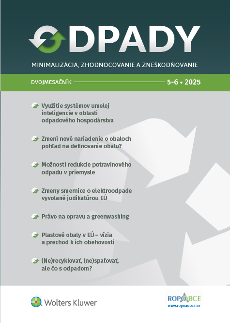 Title Odpady : minimalizácia, zhodnocovanie a zneškodňovanie : odborný dvojmesačník Issue data Bratislava : Wolters Kluwer SR ISSN 1335-7808 Year, No. Roč. 25, č. 5-6 (2025) Periodicals status Accepted (18.06.2025) Document kind časopisy Language Slovak Country of Edition Slovak Republic Database PERIODIKÁ - Prijaté čísla References - PERIODIKÁ - Súborný záznam periodika (5) - ARTICLES