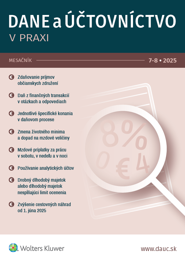Title Dane a účtovníctvo v praxi : odborný mesačník Issue data Bratislava : Wolters Kluwer ISSN 1335-7034 Year, No. Roč. 30, č. 7-8 (2025) Periodicals status Accepted (22.07.2025) Document kind časopisy Language Slovak Country of Edition Slovak Republic Database PERIODIKÁ - Prijaté čísla Copy count 1, currently available 0, at library only 1 References - PERIODIKÁ - Súborný záznam periodika (7) - ARTICLES