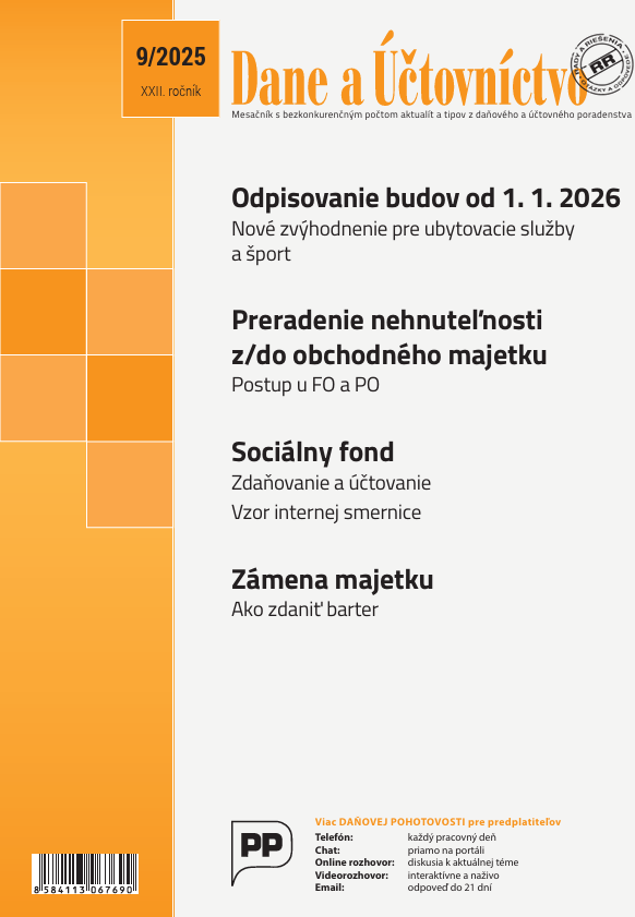 Title Dane a účtovníctvo : rady a riešenia : mesačník s bezkonkurenčným počtom aktualít a tipov z daňového a účtovného poradenstva Issue data Žilina : Poradca podnikateľa ISSN 1336-426X Year, No. Roč. 22, č. 9 (2025) Periodicals status Accepted (26.09.2025) Document kind časopisy Language Slovak Country of Edition Slovak Republic Database PERIODIKÁ - Prijaté čísla Copy count 1, currently available 0, at library only 1 References - PERIODIKÁ - Súborný záznam periodika (7) - ARTICLES