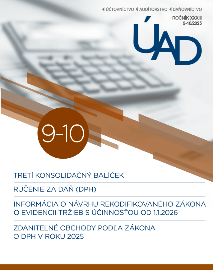 Title Účtovníctvo - audítorstvo - daňovníctvo : v teórii a praxi Parallel title Accounting. Audit. Taxation: in theory and praxis Issue data Bratislava : Slovenská komora certifikovaných účtovníkov ISSN 1335-2024 Year, No. Roč. 33, č. 9-10 (2025) Periodicals status Accepted (24.10.2025) Document kind časopisy Language Slovak Country of Edition Slovak Republic Database PERIODIKÁ - Prijaté čísla Copy count 1, currently available 0, at library only 1 References - PERIODIKÁ - Súborný záznam periodika (3) - ARTICLES