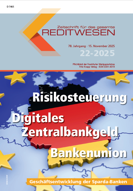 Title Zeitschrift für das gesamte Kreditwesen : Pflichtblatt der Frankfurter Wertpapierbörse Issue data Frankfurt am Main : Fritz Knapp Verlag ISSN 0341-4019 Year, No. Jg. 78, Hf. 22 (2025) Periodicals status Accepted (28.01.2026) Document kind časopisy Language German Country of Edition Germany Database PERIODIKÁ - Prijaté čísla References - PERIODIKÁ - Súborný záznam periodika