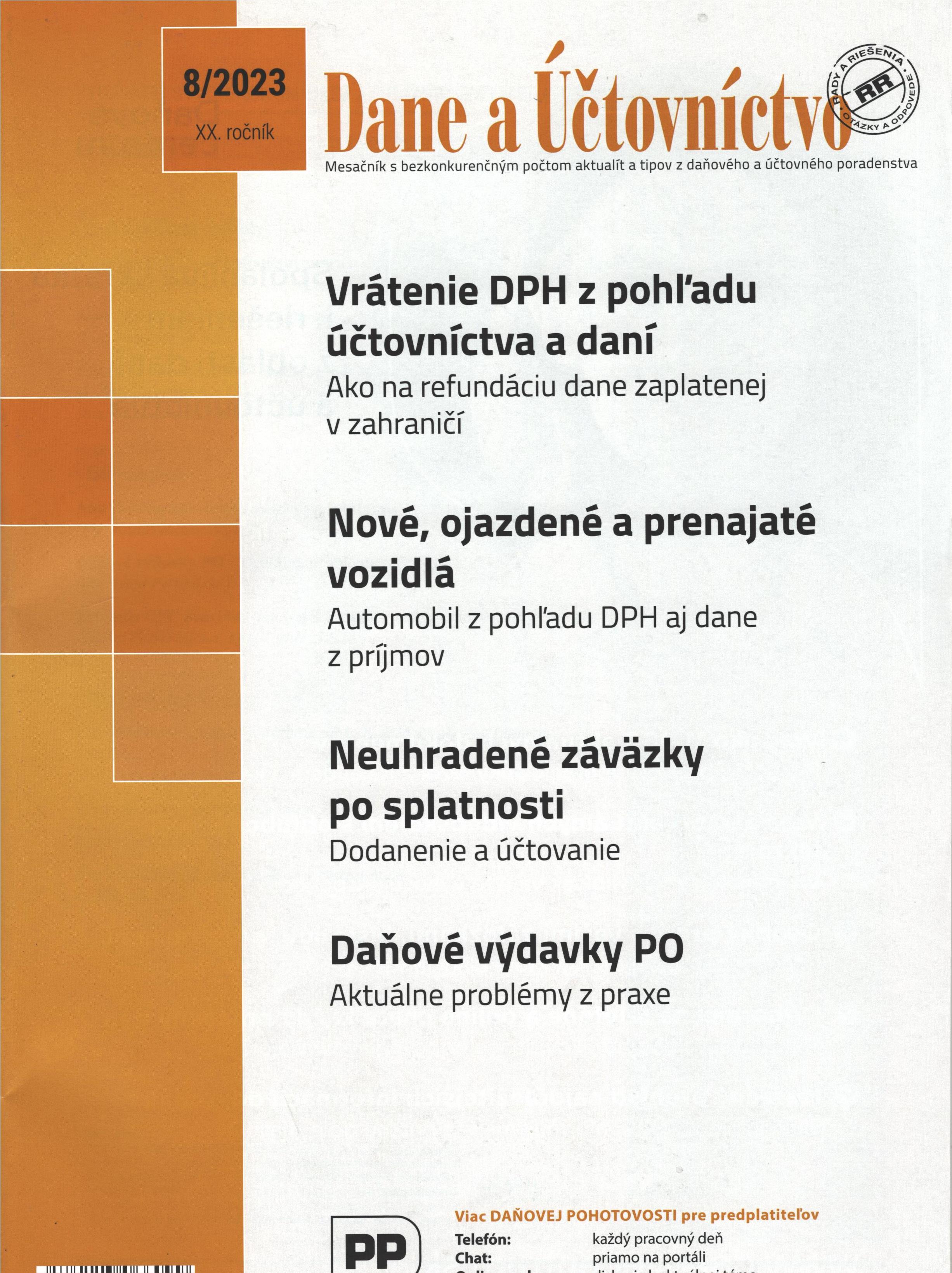 Title Dane a účtovníctvo : rady a riešenia : mesačník s bezkonkurenčným počtom aktualít a tipov z daňového a účtovného poradenstva Issue data Žilina : Poradca podnikateľa ISSN 1336-426X Year, No. Roč. 20, č. 8 (2023) Periodicals status Accepted (25.08.2023) Document kind časopisy Language Slovak Country of Edition Slovak Republic Database PERIODIKÁ - Prijaté čísla Copy count 1, currently available 0, at library only 1 References - PERIODIKÁ - Súborný záznam periodika (6) - ARTICLES