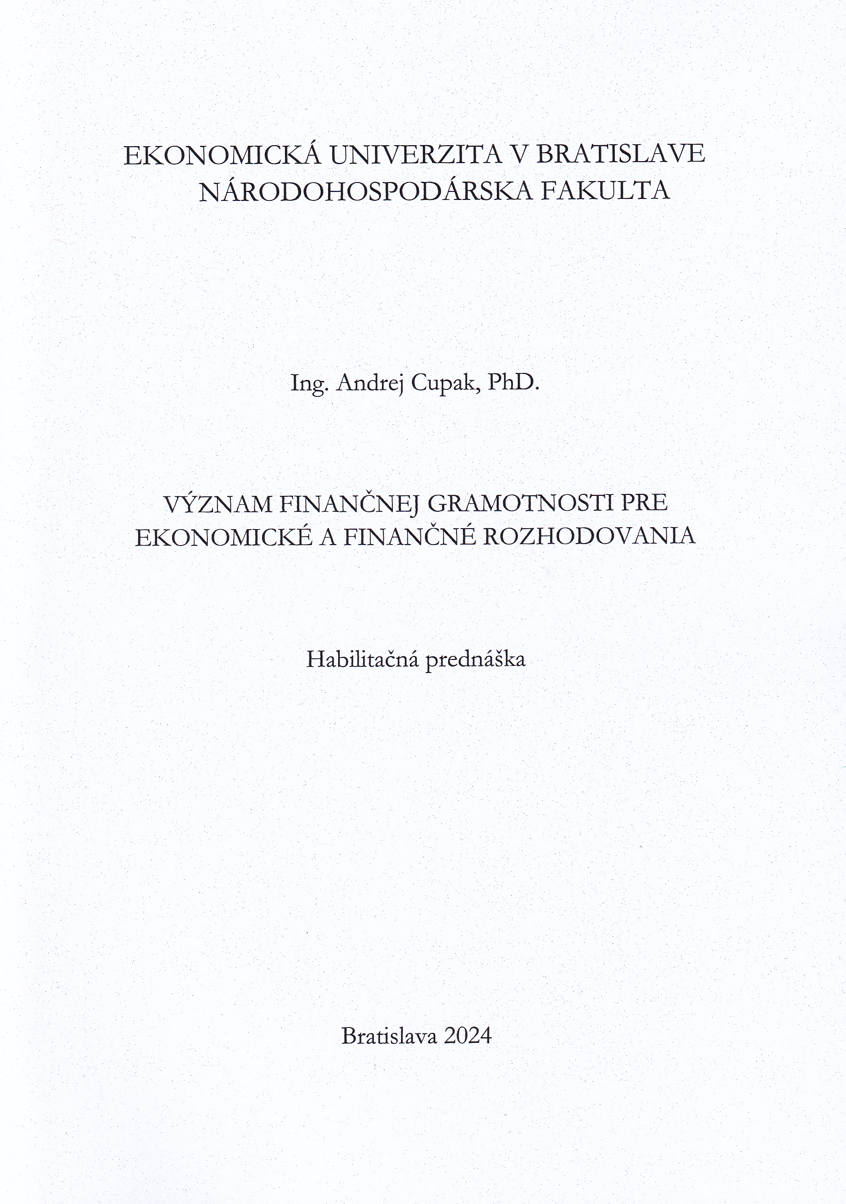 1. Title Význam finančnej gramotnosti pre ekonomické a finančné rozhodovania : habilitačná prednáška : odbor habilitačného konania: financie, bankovníctvo a investovanie