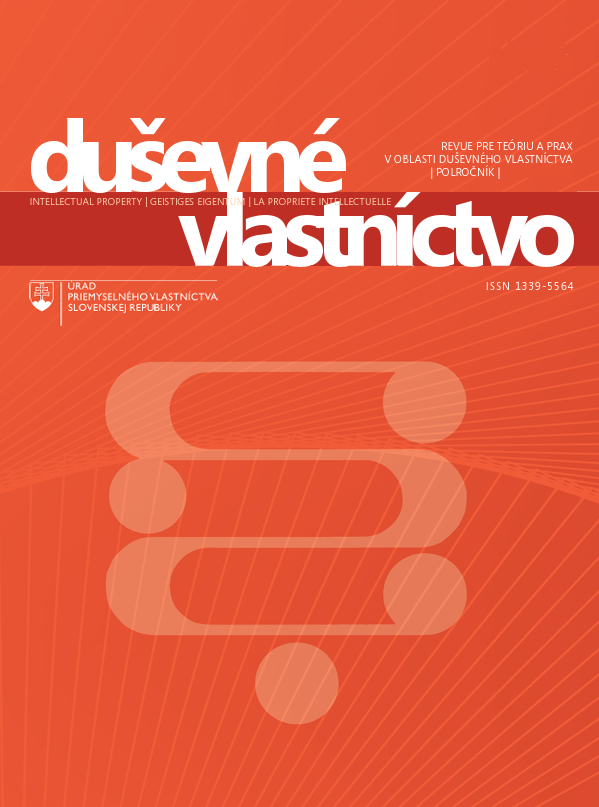 Title Duševné vlastníctvo [elektronický zdroj] : revue pre teóriu a prax v oblasti duševného vlastníctva Parallel title Intellectual property : Revue for Theory and Practice in the Field of Intellectual Property Geistiges Eigentum La Propriété intellectuelle Issue data Banská Bystrica : Úrad priemyselného vlastníctva SR ISSN 1339-5564 (online) Note Od roku 2021 vychádza vo forme otvoreného prístupu. - Do roku 2022 vychádzal 4x ročne. - Spracovaný v EKO-INDEX 2015- Replaced by Duševné vlastníctvo Periodicity 2x ročne Document kind electronic magazines Language Slovak, English, German, French Country of Edition Slovak Republic systematics 347.77 - Priemyselné, výrobné a vedecké vlastníctvo a vlastnícke vzťahy. Patentové a značkové právo Keywords vlastníctvo duševné * zákony * vynálezy * patenty * návrhy zlepšovacie * známky ochranné URL https://www.indprop.gov.sk/dv/casopis-dusevne-vlastnictvo Database PERIODIKÁ - Súborný záznam periodika References (2) - PUBLIKAČNÁ ČINNOSŤ (97) - ARTICLES (1) - PERIODIKÁ - Súborný záznam periodika References Súborný záznam: použite odkaz na záznam čísla alebo zväzku Numbers 2025: 1, 2 2024: 1, 2 2023: 1, 2 2022: 1-2, 3-4 2021: 1, 2, 3-4 2020: 1, 2, 3, 4 2019: 1, 2, 3, 4 2018: 1, 2, 3, 4 2017: 1, 3, 4 2015: 1, 3, 4