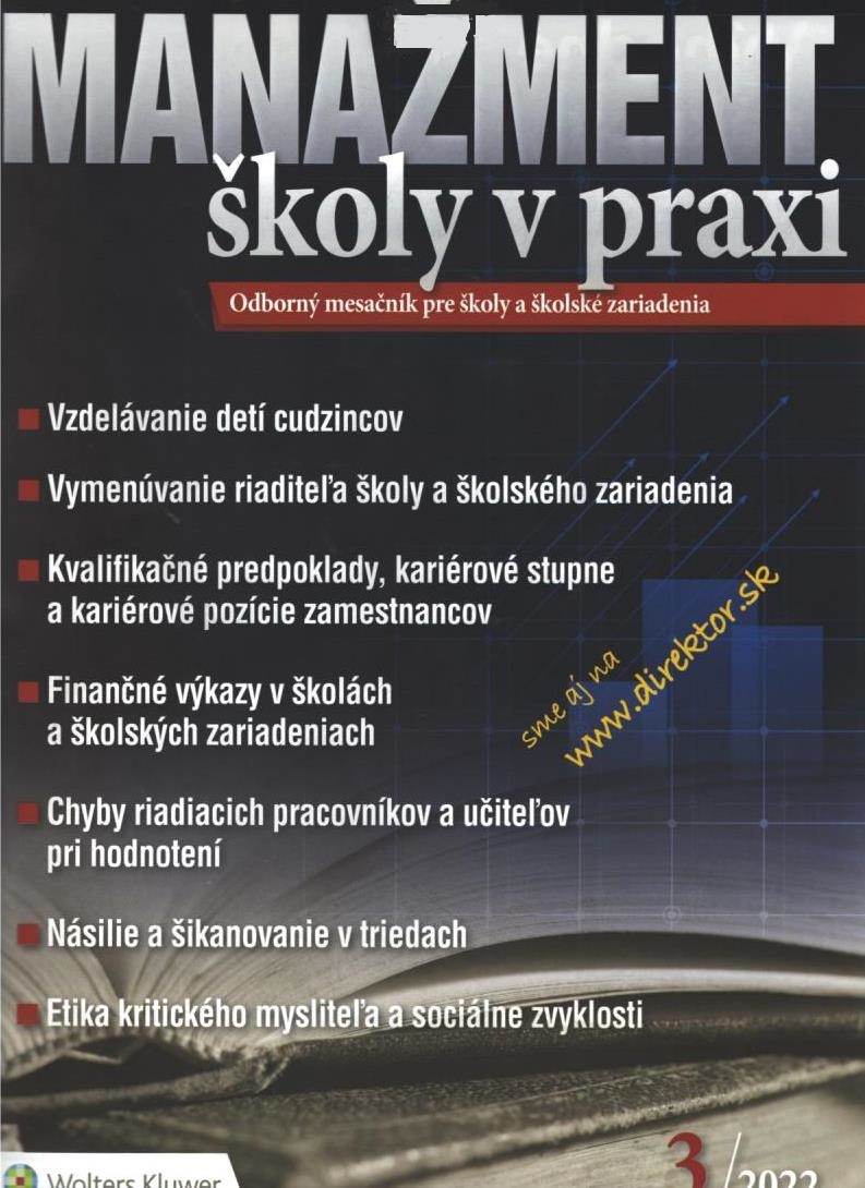 Title Manažment školy v praxi : odborný mesačník pre školy a školské zariadenia Issue data Bratislava : Wolters Kluwer ISSN 1336-9849 Year, No. Roč. 17, č. 3 (2022) Periodicals status Accepted (28.03.2022) Document kind časopisy Language Slovak Country of Edition Slovak Republic Database PERIODIKÁ - Prijaté čísla Copy count 2, currently available 0, at library only 2 References - PERIODIKÁ - Súborný záznam periodika (4) - ARTICLES