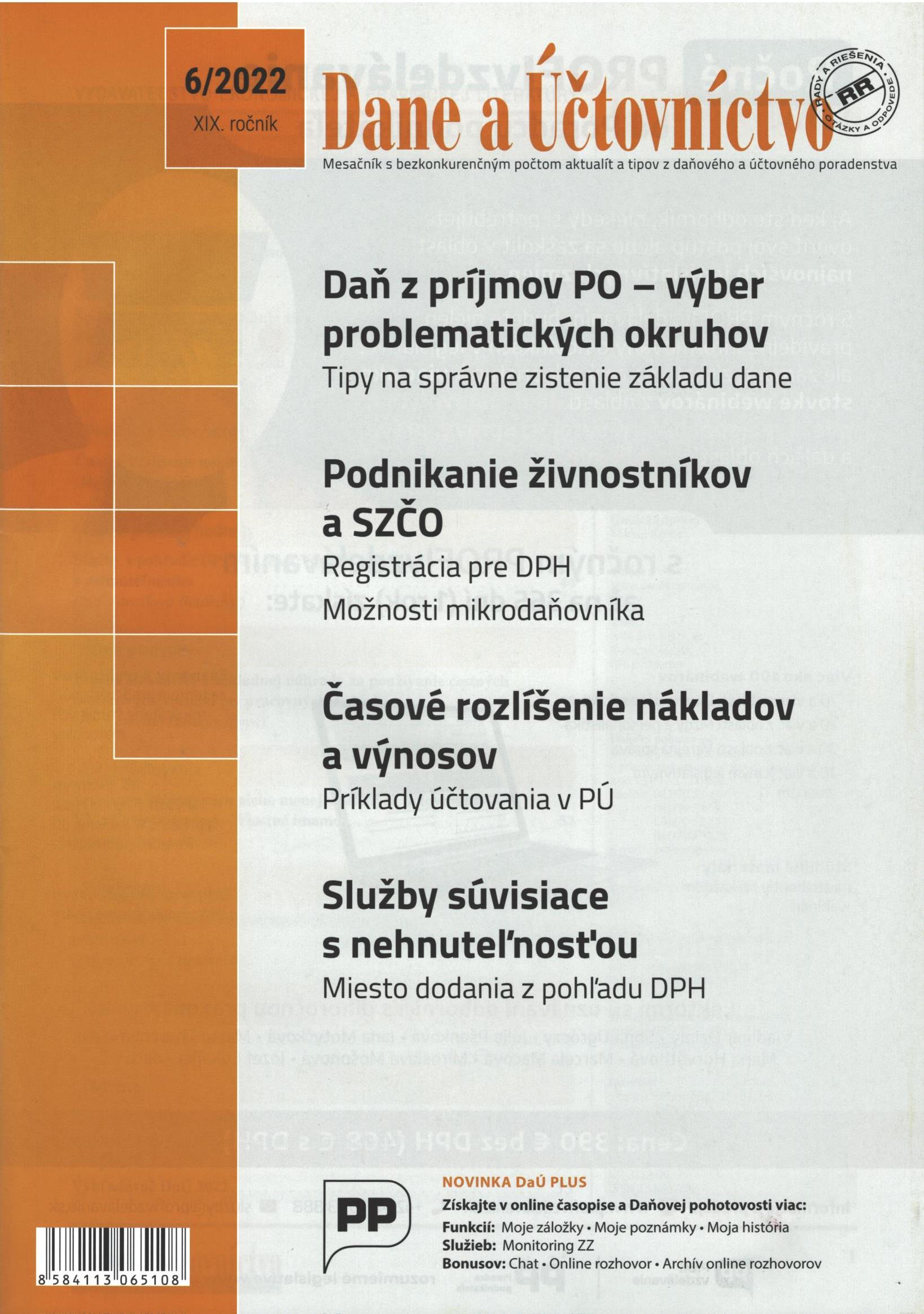 Title Dane a účtovníctvo : rady a riešenia : mesačník s bezkonkurenčným počtom aktualít a tipov z daňového a účtovného poradenstva Issue data Žilina : Poradca podnikateľa ISSN 1336-426X Year, No. Roč.19, č. 6 (2022) Periodicals status Accepted (25.05.2022) Document kind časopisy Language Slovak Country of Edition Slovak Republic Database PERIODIKÁ - Prijaté čísla Copy count 2, currently available 0, at library only 2 References - PERIODIKÁ - Súborný záznam periodika (8) - ARTICLES