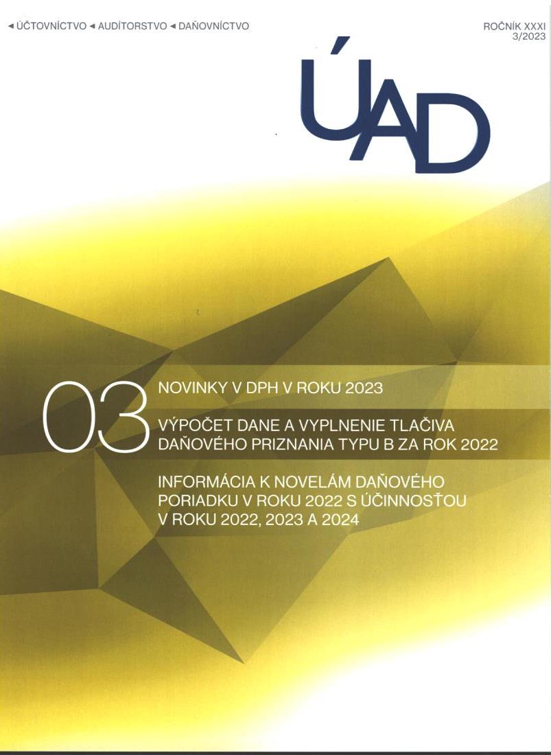 Title Účtovníctvo - audítorstvo - daňovníctvo : v teórii a praxi Parallel title Accounting. Audit. Taxation: in theory and praxis Issue data Bratislava : Slovenská komora certifikovaných účtovníkov ISSN 1335-2024 Year, No. Roč. 31, č. 3 (2023) Periodicals status Accepted (30.03.2023) Document kind časopisy Language Slovak Country of Edition Slovak Republic Database PERIODIKÁ - Prijaté čísla Copy count 2, currently available 0, at library only 2 References - PERIODIKÁ - Súborný záznam periodika (2) - ARTICLES