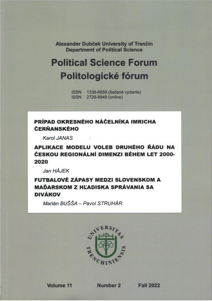 Title Politologické fórum Parallel title Political Science Forum Issue data Trenčín : Trenčianska univerzita Alexandra Dubčeka v Trenčíne ISSN 1338-6859 Year, No. Vol. 11, no. 2 (2022) Periodicals status Accepted (13.04.2023) Document kind časopisy Language Slovak Country of Edition Slovak Republic Database PERIODIKÁ - Prijaté čísla Copy count 1, currently available 0, at library only 1 References - PERIODIKÁ - Súborný záznam periodika