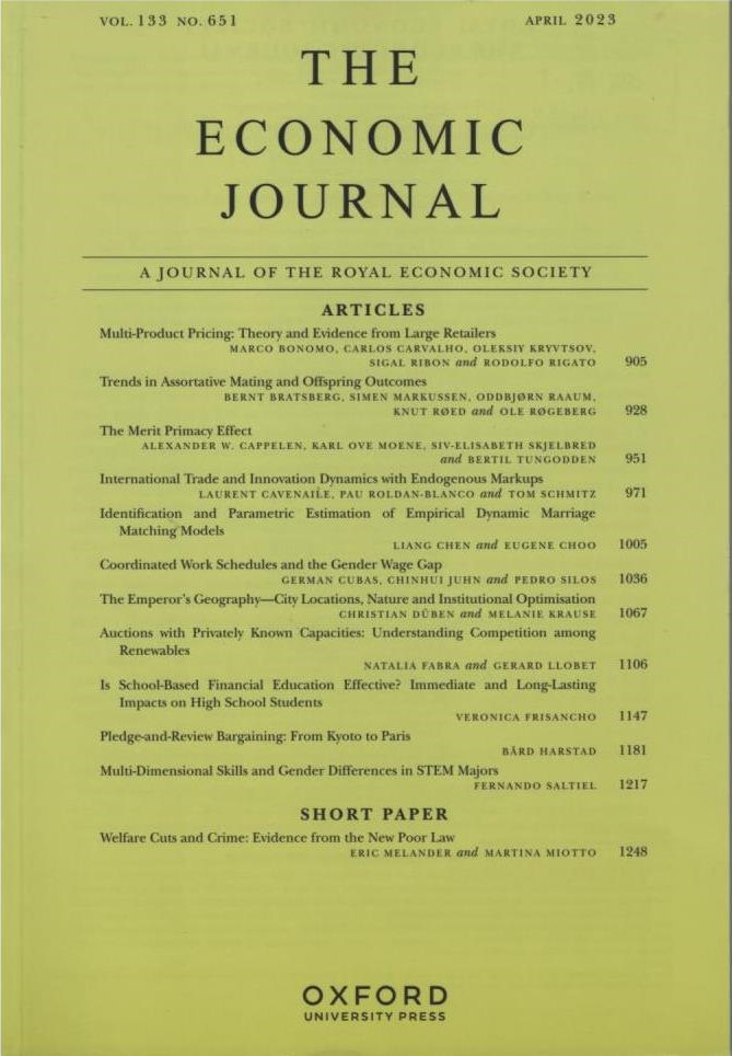 Title The Economic Journal : A Journal of the Royal Economic Society Issue data London : Royal Economic Society ISSN 0013-0133 Year, No. Vol. 133, no. 651 (April) Periodicals status Accepted (03.05.2023) Document kind časopisy Language English Country of Edition Great Britain Database PERIODIKÁ - Prijaté čísla Copy count 1, currently available 0, at library only 1 References - PERIODIKÁ - Súborný záznam periodika