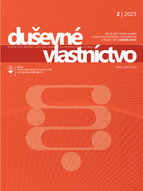Title Duševné vlastníctvo [elektronický zdroj] : revue pre teóriu a prax v oblasti duševného vlastníctva Parallel title Intellectual property : Revue for Theory and Practice in the Field of Intellectual Property Geistiges Eigentum La Propriété intellectuelle Issue data Banská Bystrica : Úrad priemyselného vlastníctva SR ISSN 1339-5564 Year, No. Roč. 27, č. 2 (2023) Periodicals status Accepted (30.11.2023) Document kind electronic magazines Language Slovak Country of Edition Slovak Republic Database PERIODIKÁ - Prijaté čísla References - PERIODIKÁ - Súborný záznam periodika (1) - PUBLIKAČNÁ ČINNOSŤ (8) - ARTICLES