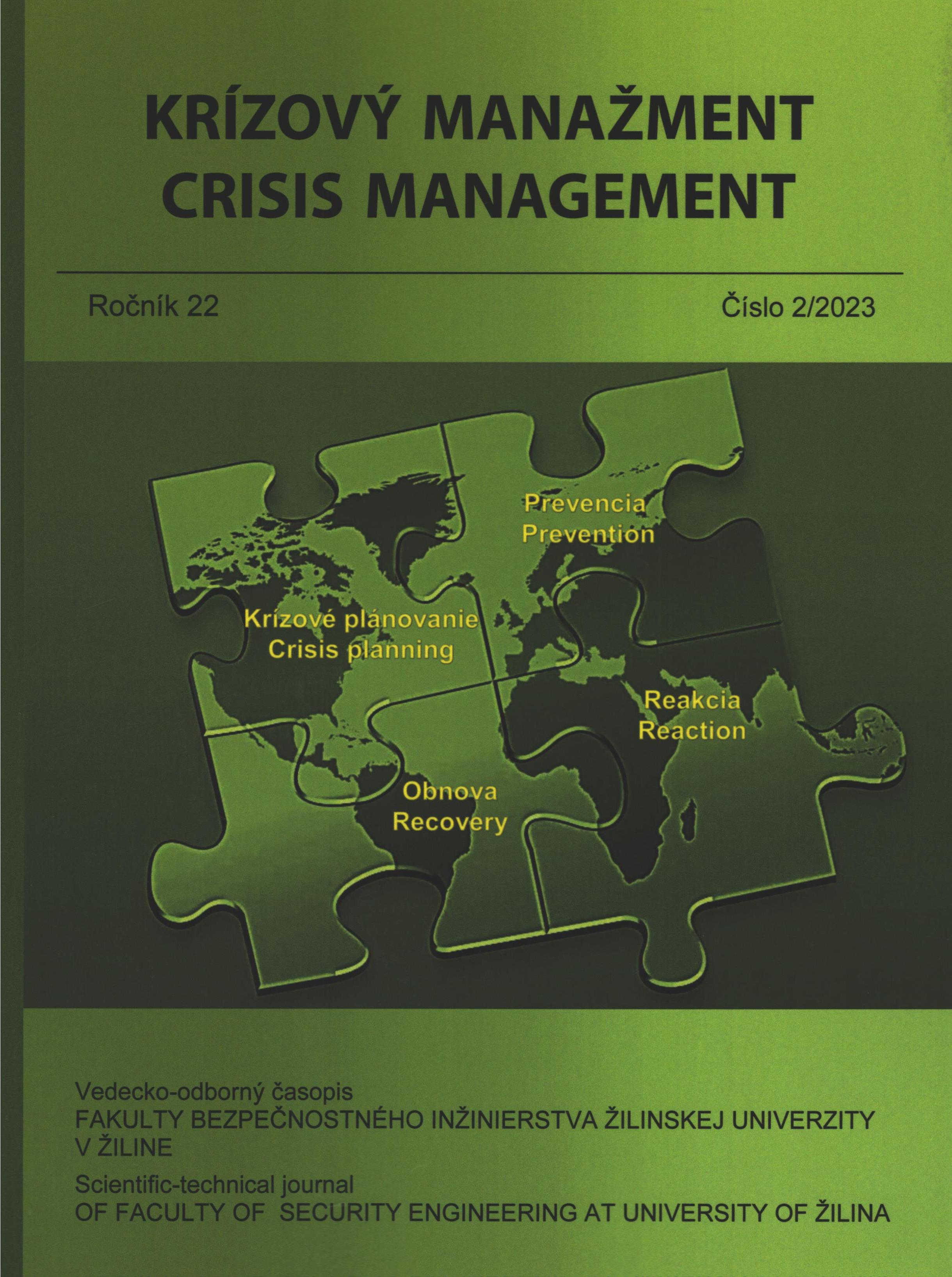 Title Krízový manažment : vedecko-odborný časopis Fakulty bezpečnostného inžinierstva Žilinskej univerzity v Žiline : časopis pre pracovníkov zaoberajúcich sa otázkami bezpečnosti, rizík, krízovým manažmentom a krízovým plánovaním Parallel title Crisis Management = Scientific-Technical Journal of Fakulty of Security Engineering at University of Žilina in Žilina Issue data Žilina : Fakulta bezpečnostného inžinierstva Žilinskej univerzity v Žiline ISSN 1336-0019 Year, No. Roč. 22, č. 2 (2023) Periodicals status Accepted (21.12.2023) Document kind časopisy Language Slovak Country of Edition Slovak Republic Database PERIODIKÁ - Prijaté čísla Copy count 1, currently available 0, at library only 1 References - PERIODIKÁ - Súborný záznam periodika (4) - ARTICLES