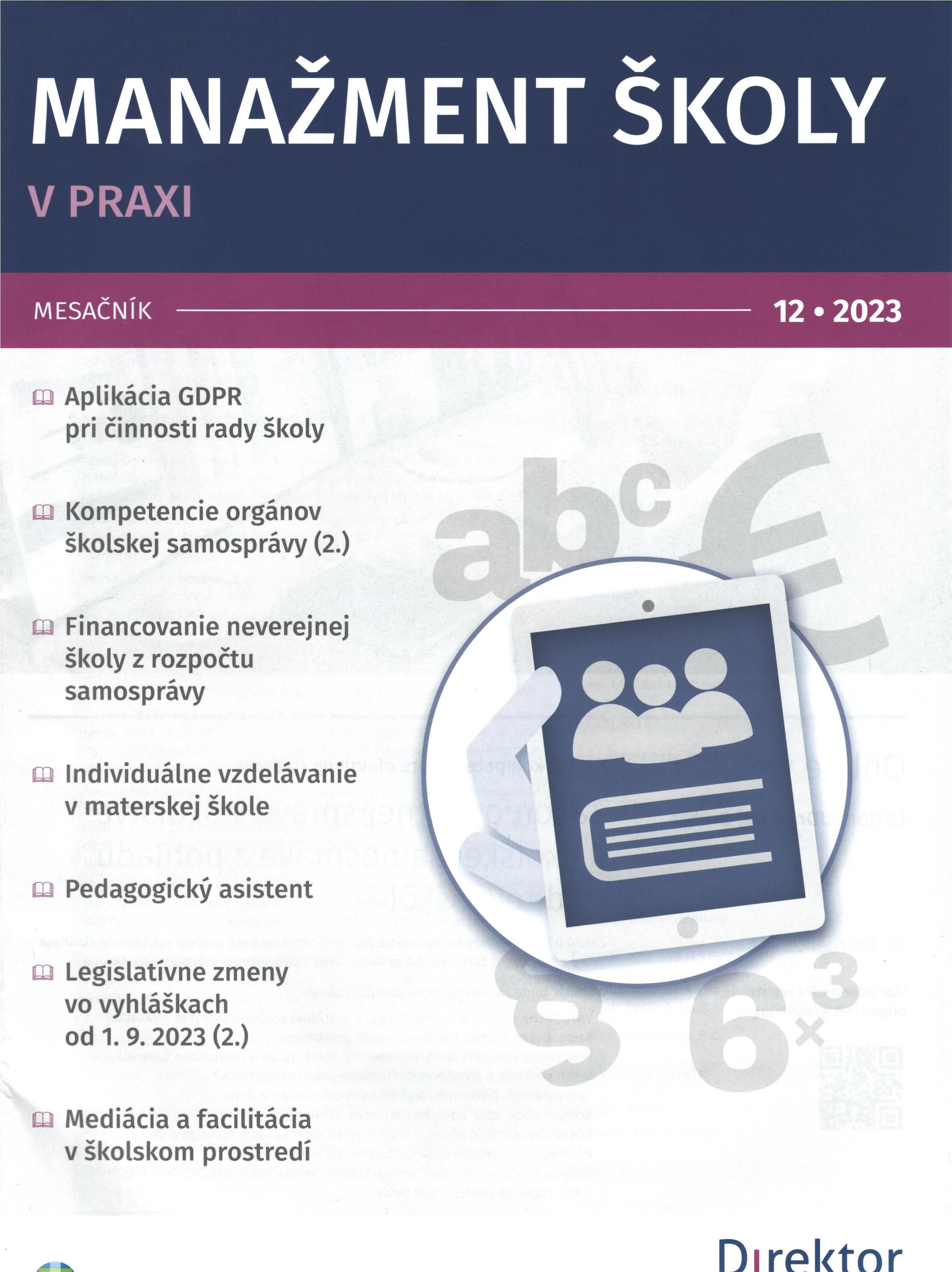 Title Manažment školy v praxi : [odborný mesačník] Issue data Bratislava : Wolters Kluwer ISSN 1336-9849 Year, No. Roč. 18, č. 12 (2023) Periodicals status Accepted (02.01.2024) Document kind časopisy Language Slovak Country of Edition Slovak Republic Database PERIODIKÁ - Prijaté čísla Copy count 2, currently available 0, at library only 2 References - PERIODIKÁ - Súborný záznam periodika (4) - ARTICLES