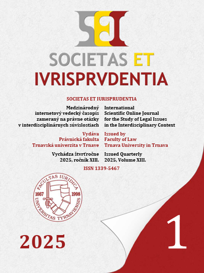 Title Societas et iurisprudentia [elektronický zdroj] : medzinárodný internetový vedecký časopis zameraný na právne otázky v interdisciplinárnych súvislostiach Parallel title Societas et iurisprudentia: International Scientific Online Journal for the Study of Legal Issues in the Inderdisciplinary Context Issue data Trnava : Trnavská univerzita v Trnave ISSN 1339-5467 Year, No. Roč. 13, no. 1 (2025) Periodicals status Accepted (06.05.2025) Document kind electronic magazines Language Multiple languages Country of Edition Slovak Republic Database PERIODIKÁ - Prijaté čísla References - PERIODIKÁ - Súborný záznam periodika (2) - ARTICLES