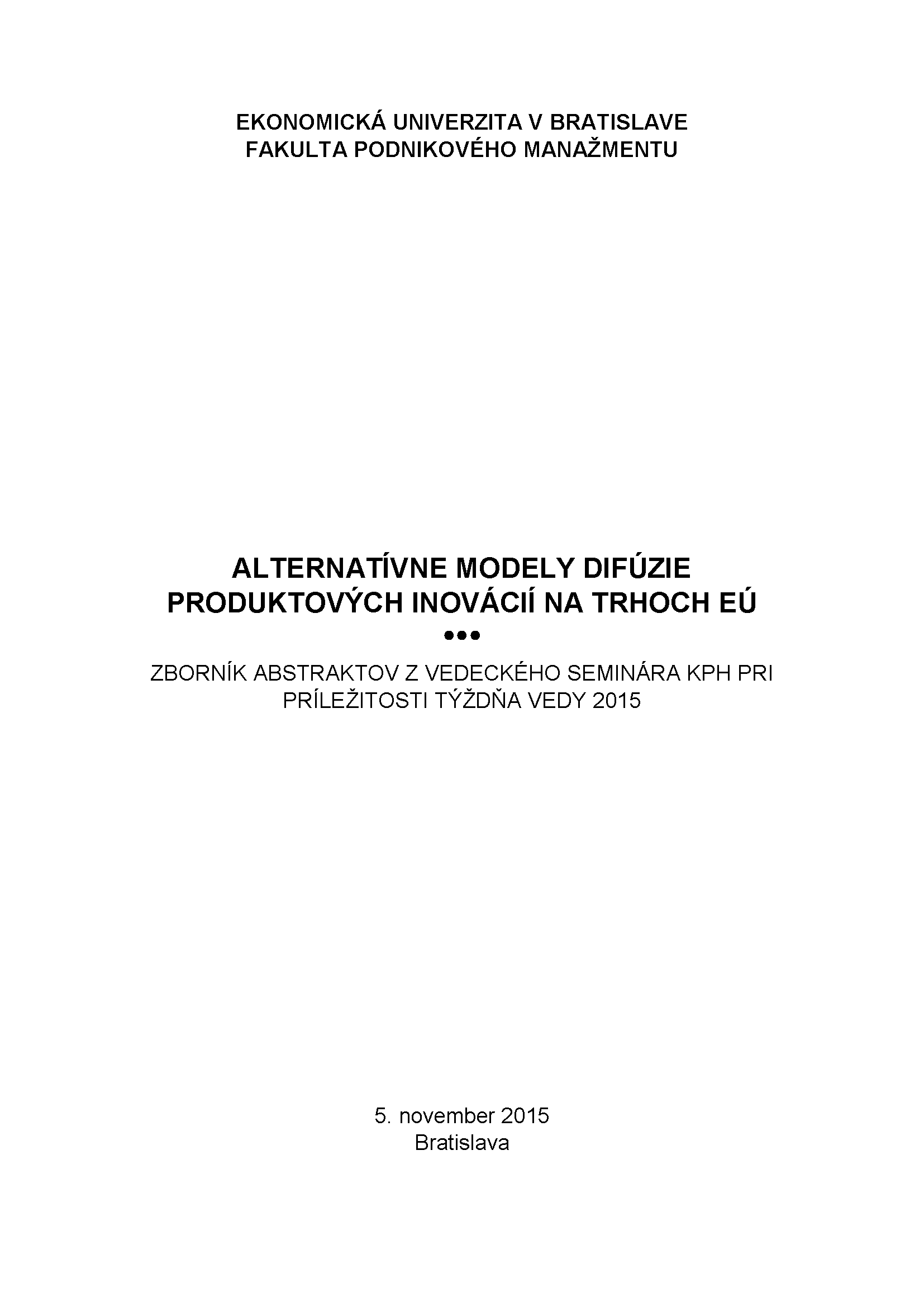 Názov Alternatívne modely difúzie produktových inovácií na trhoch EÚ [elektronický zdroj] : zborník abstraktov z vedeckého seminára KPH pri príležitosti Týždňa vedy 2015 : 5. november 2015 Bratislava Autorské údaje redakčné a zostavovateľské práce: Peter Štetka, Róbert Šlosár, Nikola Švejdová, recenzenti: Alena Tršťanská, Nora Grisáková Ďalší autori Štetka Peter (Zostavovateľ / Kompilátor) EUBFPMKPO - Katedra podnikovohospodárska FPM Šlosár Róbert (Zostavovateľ / Kompilátor) EUBFPMKPO - Katedra podnikovohospodárska FPM Švejdová Nikola (Zostavovateľ / Kompilátor) Tršťanská Alena (Recenzent) EUBFPMKPO - Katedra podnikovohospodárska FPM Grisáková Nora (Recenzent) EUBFPMKPO - Katedra podnikovohospodárska FPM Akcia/Korporácia Alternatívne modely difúzie produktových inovácií na trhoch EÚ . Vedecký seminár z Týždňa vedy , Bratislava, Slovensko , 5.11.2015 Ekonomická univerzita v Bratislave . Fakulta podnikového manažmentu Vydavateľské údaje Bratislava : Vydavateľstvo EKONÓM , 2015. - CD-ROM [76 s., 3,53 AH] Vydanie 1. vyd. ISBN 978-80-225-4175-6 Výstup z projektu IGP I-15-102-00 Alternatívne modely difúzie produktových inovácií