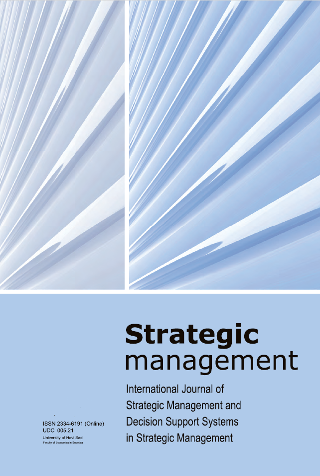 Názov Strategic Management [elektronický zdroj] : International Journal of Strategic Management and Decision Support Systems in Strategic Management Vydavateľské údaje Subotica : Faculty of Economics in Subotica University of Novi Sad ISSN 2334-6191 (online) , 1821-3448 (print) Poznámky Spracovaný v EKO-INDEX 2016-. - Registrovaný: Web of Science Periodicita 4x ročne Druh dokumentu elektronické časopisy Jazyk dokumentu angličtina Krajina vydania Srbsko Systematika 65.012.4 - Technika a metódy riadenia. Riadenie. Vedenie. Autorita Heslá manažment strategický * politika hospodárska * riadenie strategické * systémy riadenia * ekonomika vedomostná * rozhodovanie manažérske Anotácia Zdokonaľovanie a ďalší rozvoj všetkých aspektov strategického riadenia, teórie a praxe. Originálny referenčný materiál v systémoch na podporu rozhodovania v strategickom manažmente. URL https://www.smjournal.rs/index.php/home Báza dát PERIODIKÁ - Súborný záznam periodika Odkazy (17) - PUBLIKAČNÁ ČINNOSŤ (85) - ČLÁNKY Odkazy Súborný záznam: použite odkaz na záznam čísla alebo zväzku Čísla 2025: 1, 2, 3, 4 2024: 1, 2, 3, 4 2023: 1, 2, 3, 4 2022: 1, 2, 3, 4 2021: 1, 2, 3, 4 2020: 1, 2, 3, 4 2019: 1, 2, 3, 4 2018: 1, 2, 3, 4 2017: 1, 2, 3, 4 2016: 1, 2, 3, 4