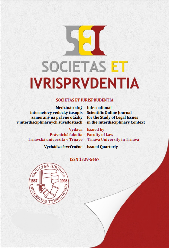 Názov Societas et iurisprudentia [elektronický zdroj] : medzinárodný internetový vedecký časopis zameraný na právne otázky v interdisciplinárnych súvislostiach Súbežný názov Societas et iurisprudentia: International Scientific Online Journal for the Study of Legal Issues in the Inderdisciplinary Context Vydavateľské údaje Trnava : Trnavská univerzita v Trnave ISSN 1339-5467 (online) Poznámky Spracovaný v EKO-INDEX 2014-. - Registrovaný: Erihplus. - Registrovaný: Index Copernicus Periodicita 4x ročne Druh dokumentu elektronické časopisy Jazyk dokumentu mnohojazyčný Krajina vydania Slovenská republika Systematika 341 - Medzinárodné verejné právo Heslá právo medzinárodné * právo európske * právo verejné * právo súkromné * vedy spoločenské * vzťahy hospodárske medzinárodné Anotácia Spoločensky významné prierezové súvislosti otázok verejného a súkromného práva na národnej, nadnárodnej, ako aj medzinárodnej úrovni prelínajúce sa s ťažiskovými oblasťami spoločensko-vedných disciplín. URL http://sei.iuridica.truni.sk/medzinarodny-vedecky-casopis/ Báza dát PERIODIKÁ - Súborný záznam periodika Odkazy (15) - PUBLIKAČNÁ ČINNOSŤ (111) - ČLÁNKY Odkazy Súborný záznam: použite odkaz na záznam čísla alebo zväzku Čísla 2025: 1, 2, 3 2024: 1, 2, 3, 4 2023: 1, 2, 3, 4 2022: 1, 2, 3, 4 2021: 1, 2, 3, 4 2020: 1, 2, 3, 4 2019: 1, 2, 3, 4 2018: 1, 2, 3, 4 2017: 1, 2, 3, 4 2016: 1, 2, 3, 4 2015: 1, 2, 3, 4 2014: 1, 2, 3, 4 2013: 1