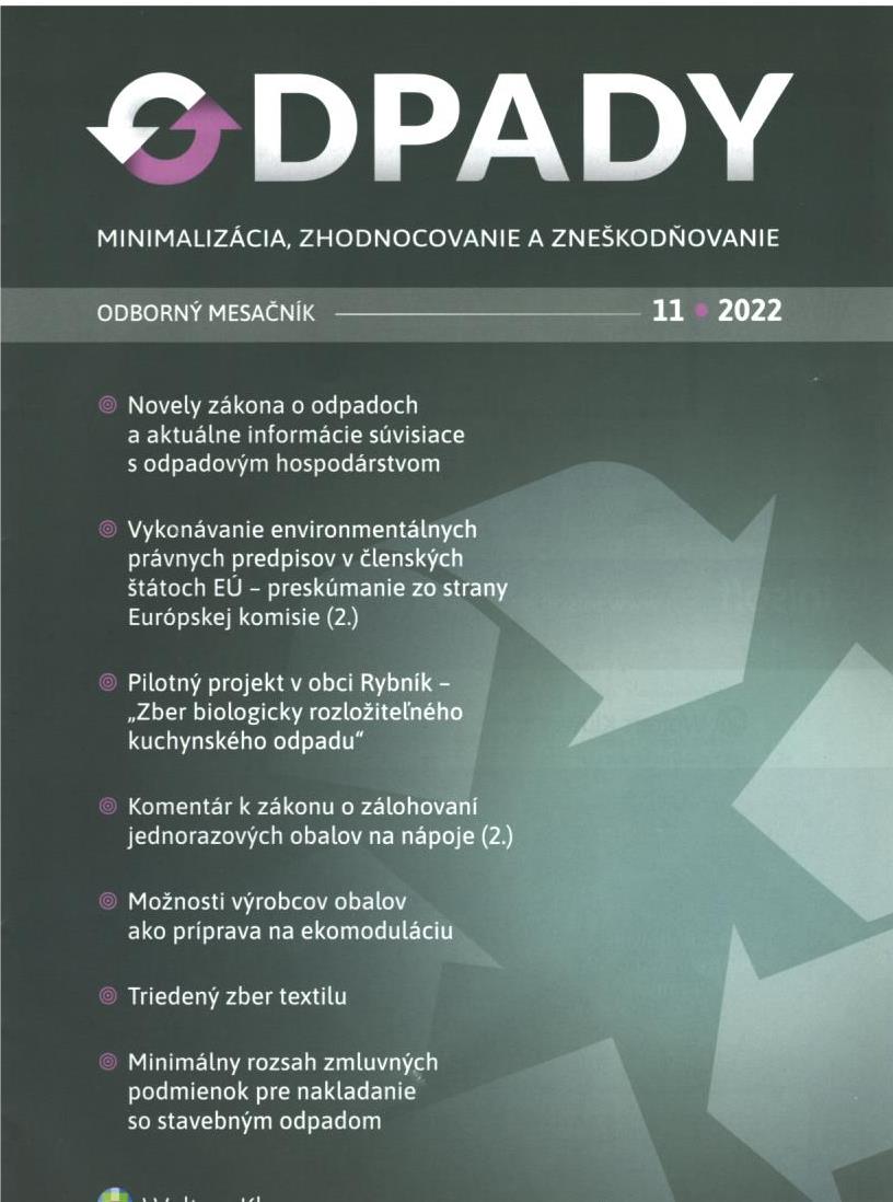 Názov Odpady : minimalizácia, zhodnocovanie, a zneškodňovanie Vydavateľské údaje Bratislava : Wolters Kluwer SR ISSN 1335-7808 Roč., číslo Roč. 22, č. 11 (2022) Status periodika prijaté (25.11.2022) Druh dokumentu časopisy Jazyk dokumentu slovenčina Krajina vydania Slovenská republika Báza dát PERIODIKÁ - Prijaté čísla Počet ex. 1, z toho voľných 0, prezenčne 1 Odkazy - PERIODIKÁ - Súborný záznam periodika (2) - ČLÁNKY