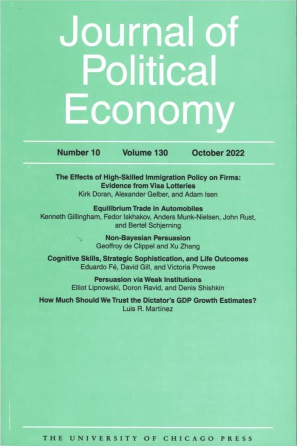 Názov Journal of Political Economy Vydavateľské údaje Chicago : The University of Chicago Press ISSN 0022-3808 Roč., číslo Vol. 130, no. 10 (2022) Status periodika prijaté (11.01.2023) Druh dokumentu časopisy Jazyk dokumentu angličtina Krajina vydania Spojené štáty Báza dát PERIODIKÁ - Prijaté čísla Počet ex. 1, z toho voľných 0, prezenčne 1 Odkazy - PERIODIKÁ - Súborný záznam periodika