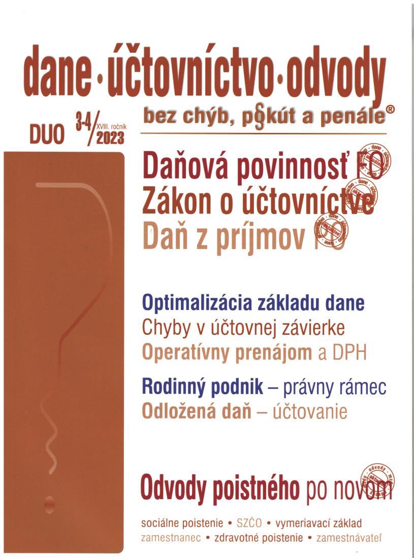 Názov Dane - účtovníctvo - odvody : bez chýb, pokút a penále Vydavateľské údaje Žilina : Poradca ISSN 1336-7986 Roč., číslo Roč. 18, č. 3-4 (2023) Status periodika prijaté (13.02.2023) Druh dokumentu časopisy Jazyk dokumentu slovenčina Krajina vydania Slovenská republika Báza dát PERIODIKÁ - Prijaté čísla Počet ex. 2, z toho voľných 0, prezenčne 2 Odkazy - PERIODIKÁ - Súborný záznam periodika